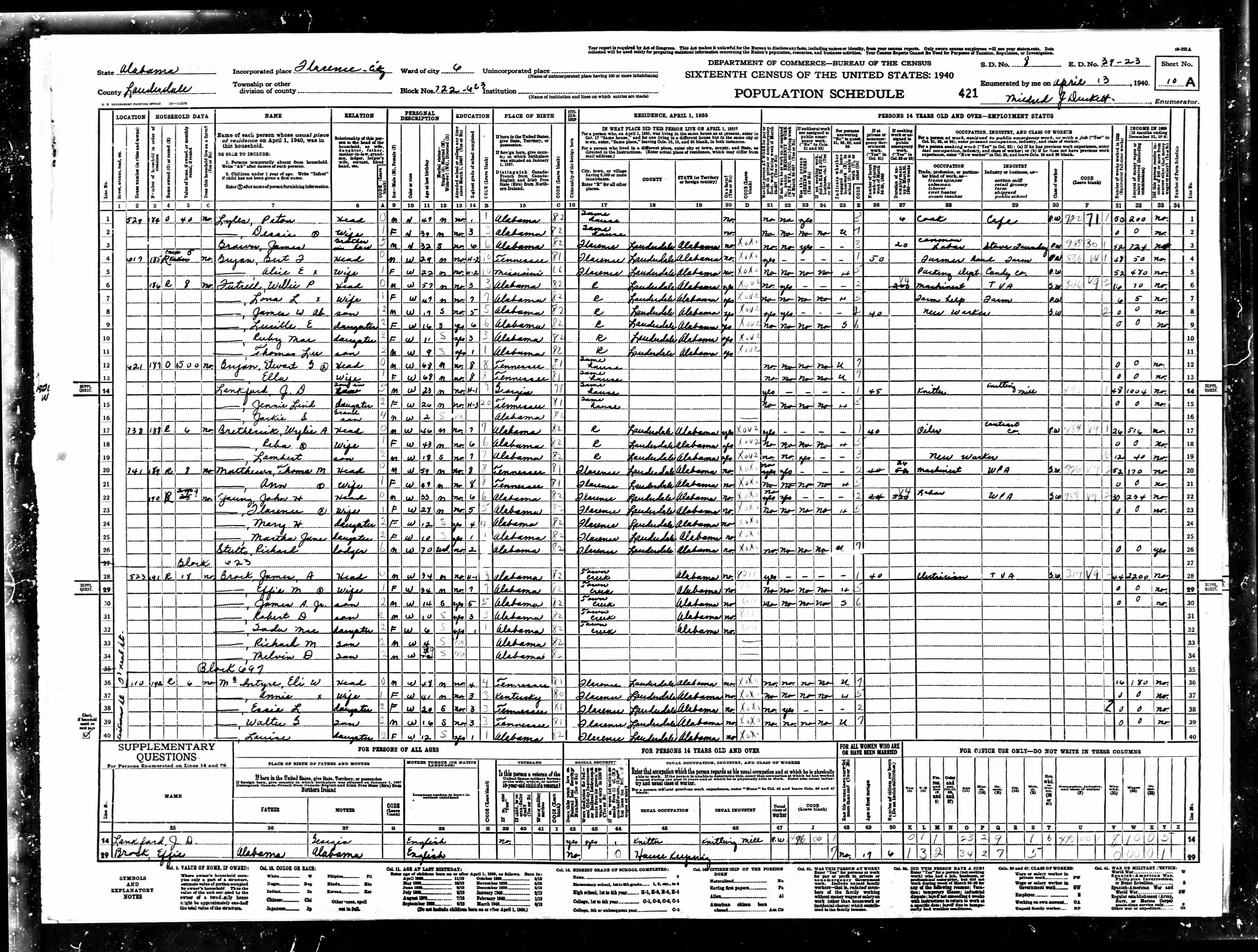1940, Florence, Ward 6, Enumeration District 20-22, Lauderdale County, Alabama, page 421a, Sheet 10a |