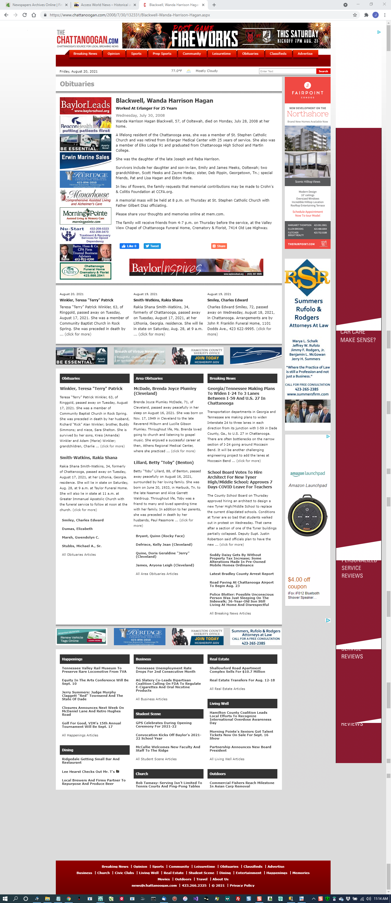Obituary | ![]() Wanda Harrison Hagan Blackwell, 57, of Ooltewah, died Monday, July 28, 2008 at her home. A lifelong resident of the Chattanooga area, she was a member of St. Stephen Catholic Church and was retired from Erlanger Medical Center with 25 years of service. She also was a member of Elks Lodge 91 and graduated from Chattanooga High School and Martin College. She was the daughter of the late Joseph and Reba Harrison. Survivors include her daughter and son-in-law, Emily and James Meeks, Ooltewah; two grandchildren, Scott Meeks and Zayne Meeks; sister, Deb Pippin, Georgetown, Tenn.; special friends, Pat and Lisa Hagan and Eldon Hyde. In lieu of flowers, the family request that memorial contributions may be made to Crohn's & Colitis Foundation at CCFA.org. A memorial mass will be held at 8 p.m. Thursday at St. Stephen Catholic Church with Father Gilbert Diaz officiating. Please share your thoughts and memories online at mem.com. The family will receive friends from 4-7 p.m. Thursday before the service, at the Valley View Chapel of Chattanooga Funeral Home, Crematory & Florist, 7414 Old Lee Highway. |
