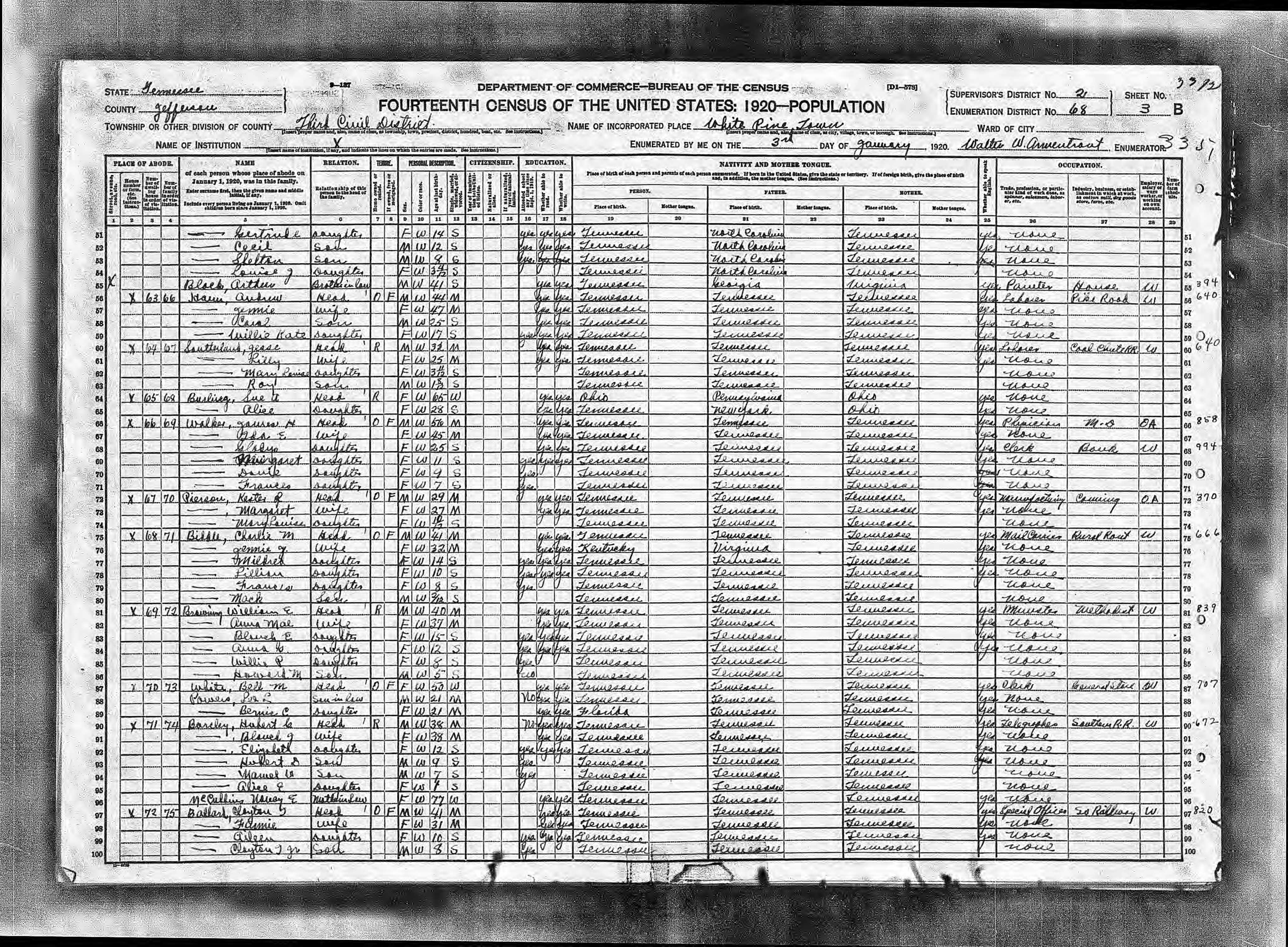 1920 Census | ![]() Household of his father Charles Mac Biddle Sr., Dist. 3, Enumeration District 68, White Pine Town , 3 Jan 1920 Mack 2/12, son, male, single, white, born TN, father born TN, mother born TN.3 |
