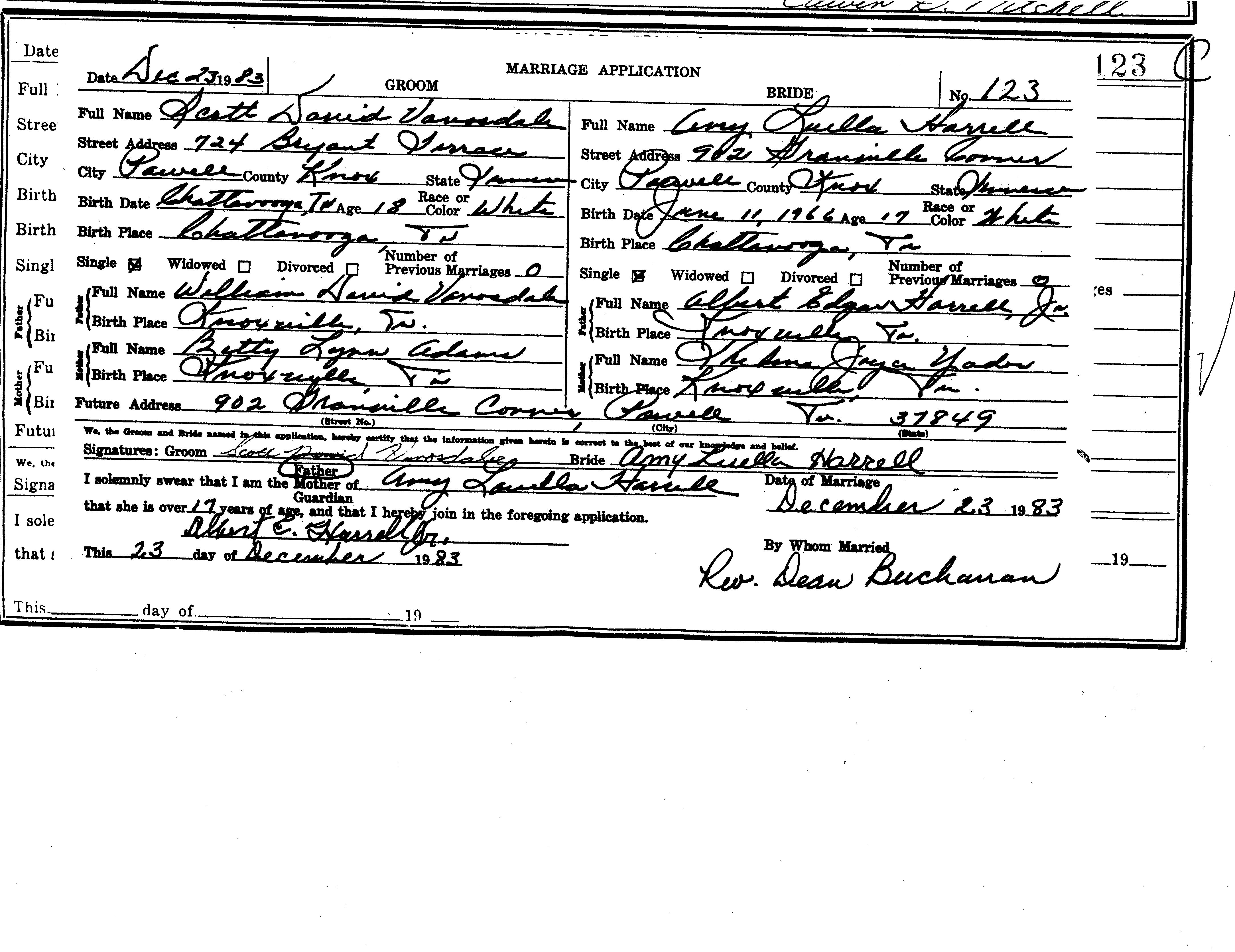 Marriage Record | ![]() ![]() ![]() Groom: Name - Albert E. Harrell Jr., Address - R #5, Knoxville, Knox County, Tenn., Born - Sept 11th 1925, Age - 24, Race - w, Birth Place - Knox Co Tenn, Divorced, Previous marriages - 1, Father - Albert E Harrell Sr., born - Tenn, Mother - Reba Hamilton, born - Tenn. Bride - Joyce Nall, Address - R #12, Knoxville, Knox County, Tenn., Born - Sept 18th 1927, Age - 22, Race - w, Birth Place - Knox Co Tenn, Divorced, Previous marriages - 1, Father - Bayard Yadon, born - Tenn, Mother - Ella Peters, born - Tenn. Future address - R #5, Knoxville, Tenn. (signed) A. E. Harrell Jr., Joyce Nall. Marriage License, State of Tennessee, County of Knox. To any Minister of the Gospel, Priest or Jewish Rabbi, having the care of Souls, or Judge, or Justice of the Peace for said County - Greeting: I, J. W. (Jack) Dance, Clerk of Knox County aforesaid, by the power in me vested by law, do license you or either of you, to celebrate the: Rites of Matrimony between Albert E. Harrell Jr. of Knoxville, Tenn and Joyce Nall of Knoxville, Tenn. Given at office in Knoxville, the 1st day of July 1950 and of American Independence 172. (signed) J. W. Dance, Clerk, by Tom Kirby, Deputy Clerk. No. 1078, Marriage License, Albert E Harrell, Jr TO Joyce Nall, 1950, J. W. (Jack) Dance, Clerk. I solemnized the Rites of Matrimony between the above parties on the 4th day of July, 1950. Harold E. Huffman, Minister, Presbyterian Church, U.S.A.7 |
