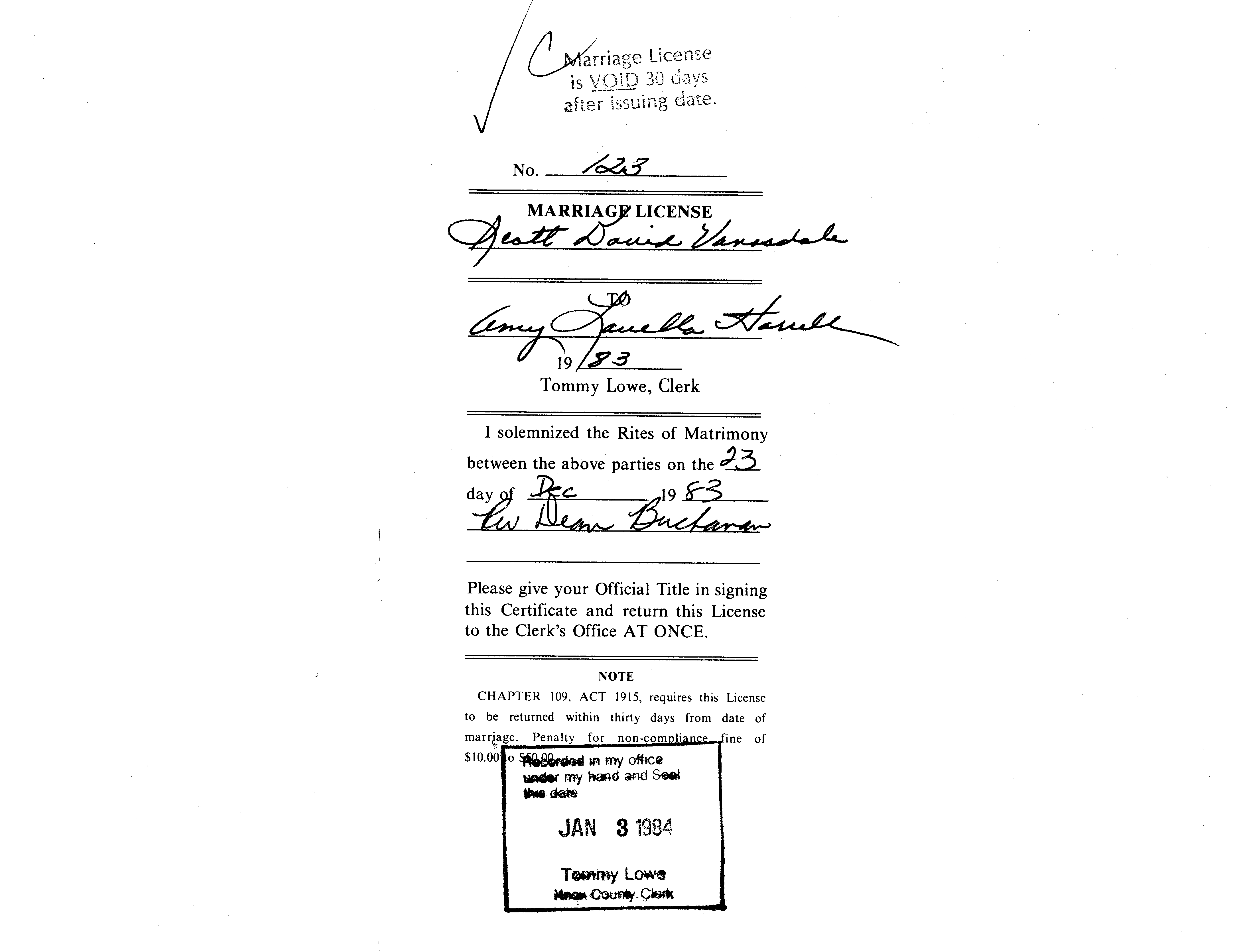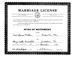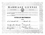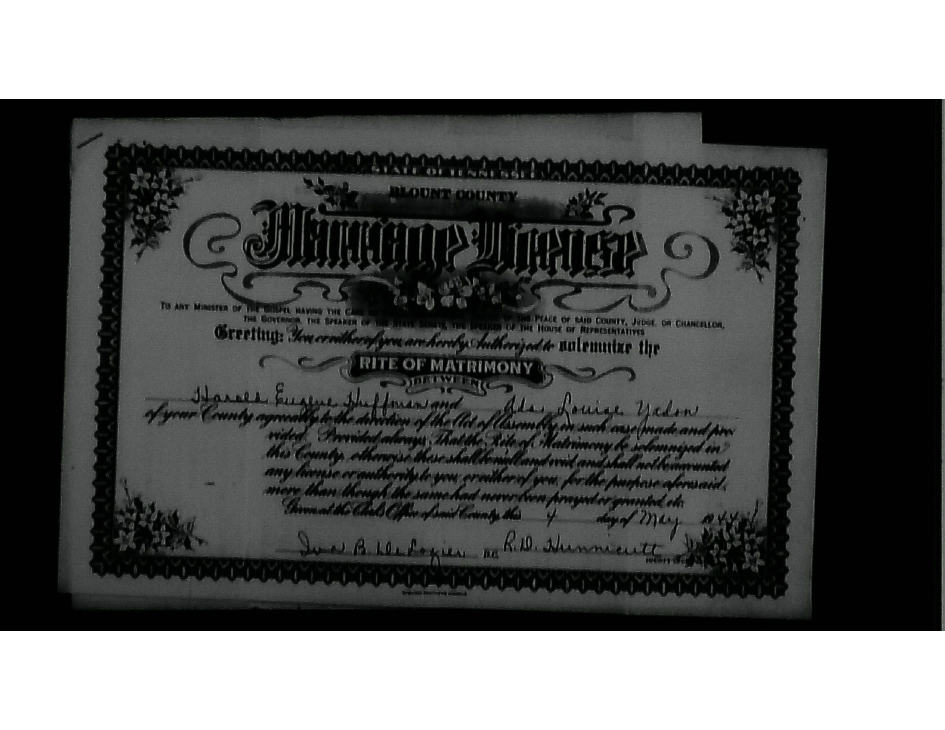 Marriage Record | ![]() ![]() To any Minister of the Gospel having the care of Souls, or to any Judge, Chancellor, or Justice of the Peace of said County, Judge or Chancellor, the Governor, the Speaker the State Senate, the Speaker of the House of Representatives, Greeting: You or all of you are hereby authorized to solemnize the Rite of Matrimony between Harold Eugene Huffman and Ada Louise Yadon of your County agreeably to the direction of an Act of Assembly in such cases made and provided; Provided always, That the ceremony be performed in this County; otherwise these shall be null and void, and shall not be accounted any license or authority to you, or either of you, for the aforesaid, more than though the same had never been prayed or granted, etc. Given at the Clerk's Office of said County the 4 day of May, 1944. (signed) Iva B. DeLozier, D.C. R. D. Hunnicutt, Clerk. No. 85, Marriage License, Harold Eugene Huffman and Ada Louise Yadon, Issued May 4, 1944. R. D. Hunnicutt, Clerk. I solemnized the Rite of Matrimony between the within-named parties on the 14th day of May 1944. John A. Gates, Minister of the Gospel. Returned 19 day of May 1944. R. D. Hunnicutt, Clerk. Recorded in Marriage Record, book 32, page 85.10,5 |