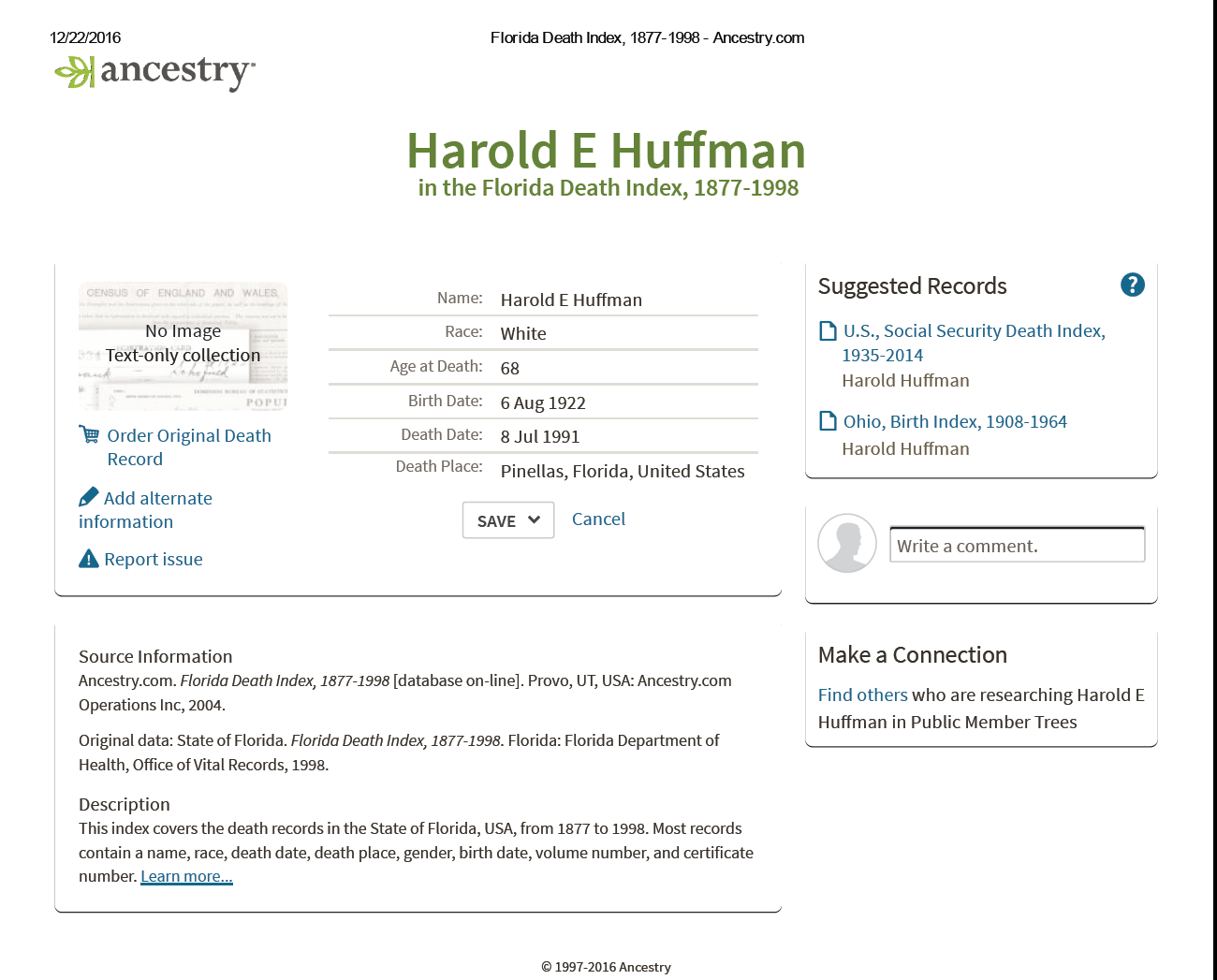 Death Record | ![]() Name: Harold E Huffman Death Date: 8 Jul 1991 County of Death: Pinellas State of Death: Florida Age at Death: 68 Race: White Birth Date: 6 Aug 1922.7 |