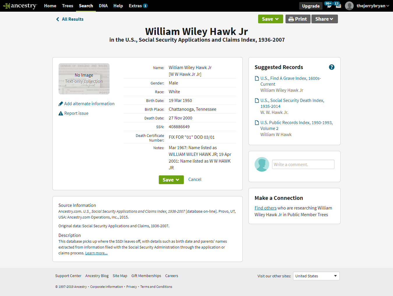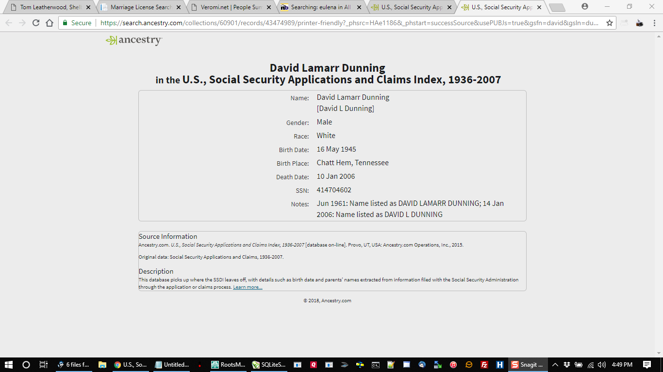 - [S2537] U.S. Social Security Death Index (SSDI): Dunning, David Lamarr; viewed at www.ancestry.com on 2 August 2018.