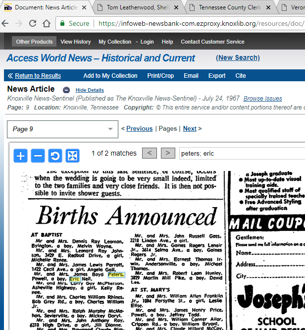 - [S2557] Birth Announcement: Peters, Eric Neil; Knoxville News-Sentinel [Knoxville, Tennessee], 24 July 1967, Baptist Hospital, page 9, viewed at www.newsbank.com on 15 August 2018.
