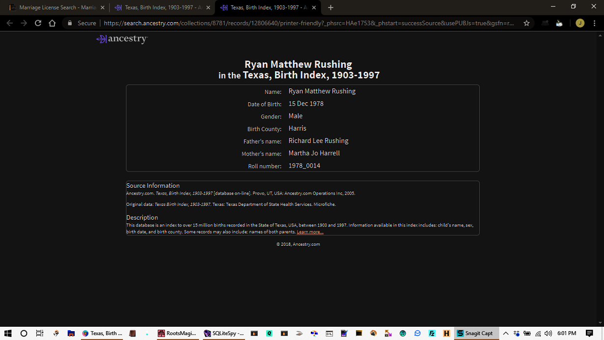 - [S2648] Birth Index: Rushing, Ryan Matthew; Harris County, Texas; 1978; Roll number: 1978_0014, www.ancestry.com, viewed 27 September 2018.