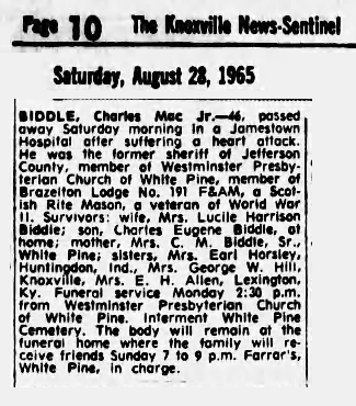 Biddle, Charles Mac Jr.- 46. passed away Saturday morning in a Jamestown Hospital after suffering a heart attack. He was the former sheriff of Jefferson County, member of Westminster Presbyterian Church of White Pine, member of Brazelton Lodge No. 191 F&AM, a Scotish Rite Mason, a veteran of World War II. Survivors: wife, Mrs. Lucile Harrison Biddle; son, Charles Eugene Biddle, at home; mother, Mrs. C. M. Biddle, Sr., White Pine; sisters, Mrs. Earl Hersley, Huntingdon, Ind., Mrs. George W. Hill, Knoxville, Mrs. E. H. Allen, Lexington,Ky. Funeral service Monday 2:30 p.m. from Westminster Presbyterian Church of White Pine. Interment White Pine Cemetery. The body will remain at the funeral home where the family will receive friends Sunday 7 to 9 p.m. Farrar's, White Pine, in charge.