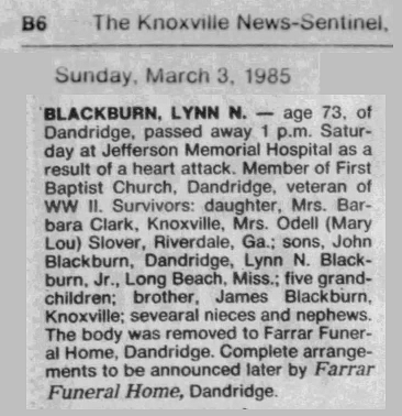 Blackburn, Lynn N. - age 73, of Dandridge, passed away 1 p.m. Saturday at Jefferson Memorial Hospital as result of a heart attack. Member of First Baptist Church, Dandridge, veteran of WW II. Survivors: daughter, Mrs. Barbara Clark, Knoxville, Mrs. Odell (Mary Lou) Slover, Riverdale, Ga.; sons, John Blackburn, Dandridge, Lynn N. Blackburn, Jr., Long Beach, Miss.; five grandchildren; brother, James Blackburn, Knoxville; several nieces and nephews. The body was removed to Farrar Funeral Home, Dandridge. Complete arrangements to be announced later by Farrar Funeral Home, Dandridge.