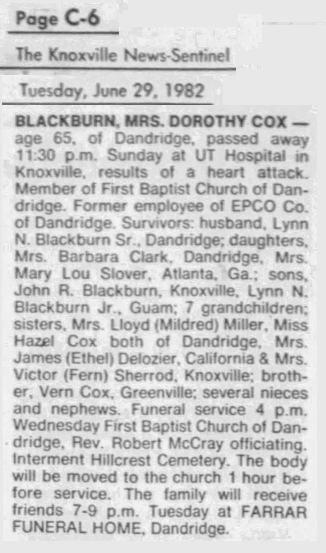 Blackburn, Mrs. Dorothy Cox - age 65, of Dandridge, passed away 11:30 p.m. Sunday at UT Hospital in Knoxville, results of a heart attack. Member of First Baptist Church of Dandridge. Former employee of EPCO Co. of Dandridge. Survivors: husband, Lynn N. Blackburn Sr., Dandridge; daughters, Mrs. Barbara Clark, Dandridge, Mrs Mary Lou Slover, Atlanta, Ga; sons, John R. Blackburn, Knoxville. Lynn N. Blackburn Jr., Guam; 7 grandchildren; sisters, Mrs Lloyd (Mildred) Miller, Miss Hazel Cox both of Dandridge, Mrs James (Ethel) Delozier, California & Mrs Victor (Fern) Sherrod, Knoxville; brother, Vern Cox. Greenville; several nieces and nephews. Funeral service 4 p.m. Wednesday First Baptist Church of Dandridge, Rev. Robert McCray officiating. Interment Hillcrest Cemetery. The body will be moved to the church 1 hour before service. The family will receive friends 7-9 p.m. Tuesday at Farrar Funeral Home, Dandridge.