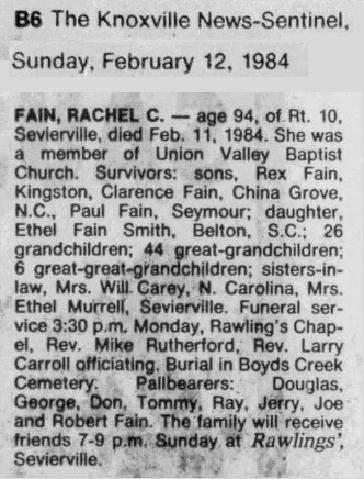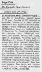 - [S3039] Obituary: Blackburn, Mrs. Dorothy Cox; Knoxville News-Sentinel [Knoxville, Tennessee], 29 June 1982, page C6, viewed at newspapers.com on 1 September 2022.