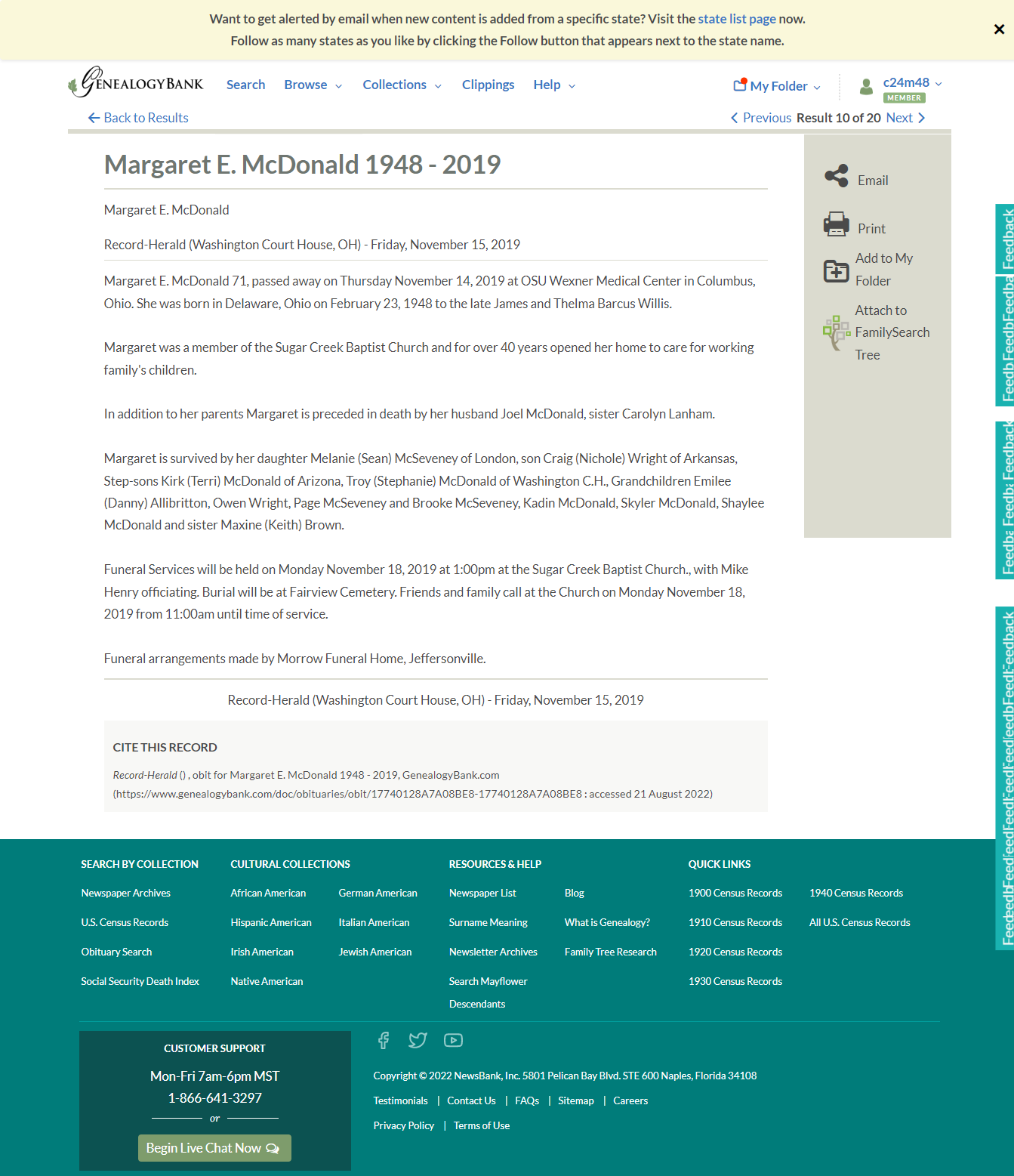 - [S3038] Obituary: McDonald, Margaret E.; Record-Herald [Washington Court House, Ohio], 15 November 2019, viewed at www.genealogybank.com on 21 August 2022.