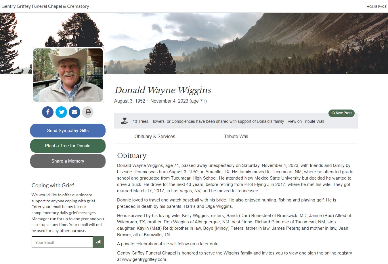 Donald Wayne Wiggins, age 71, passed away unexpectedly on Saturday, November 4, 2023, with friends and family by his side. Donnie was born August 3, 1952, in Amarillo, TX. His family moved to Tucumcari, NM, where he attended grade school and graduated from Tucumcari High School. He attended New Mexico State University but decided he wanted to drive a truck. He drove for the next 43 years, before retiring from Pilot Flying J in 2017, where he met his wife. They got married March 17, 2017, in Las Vegas, NV, and he moved to Tennessee. Donnie loved to travel and watch baseball with his bride. He also enjoyed hunting, fishing and playing golf. He is preceded in death by his parents, Harris and Olga Wiggins. He is survived by his loving wife, Kelly Wiggins; sisters, Sandi (Dan) Bonesteel of Brunswick, MD, Janice (Bud) Allred of Wildorado, TX; brother, Ron Wiggins of Albuquerque, NM; best friend, Richard Primrose of Tucumcari, NM; step daughter, Kaylin (Matt) Reid; brother in law, Boyd (Mindy) Peters; father in law, James Peters; and mother in law, Jean Brewer, all of Knoxville, TN. A private celebration of life will follow on a later date. Gentry Griffey Funeral Chapel is honored to serve the Wiggins family and invites you to view and sign the online registry at www.gentrygriffey.com.