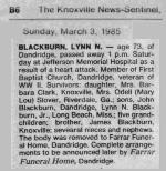 - [S3013] Obituary: Blackburn, Lynn N.; Knoxville News-Sentinel [Knoxville, Tennessee], 3 March 1985, page 4, viewed at newspapers.com on 7 February 2022.