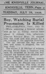 Philadelphia, Tenn., July 15. While watching a funeral procession go by a filling station here about 3 o’clock this afternoon, Charles Edward Bray, 10, stepped into the road and was struck by a car coming in the opposite direction. The car carried the boy several feet and when it stopped, the lad was dead. The driver. J. E. Philips of Atlanta, driving South from a vacation trip, said he swerved to avoid the boy, applied his brakes and skidded several feet, but to no avail. Sheriff Tom Hart, after investigating, declared the accident was unavoidable. Mr. Philips was allowed to go on his way. The body of the boy was taken to an undertaker’s at Loudon. He was the son of Charles Gray (sic). (The article misidentified Charles Frederick Bray as Charles Edward Bray in addition to misspelling his father's name. The article was dated July 15th but appeared in the paper on July 16th.)