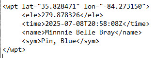 - [S3434] GPS for Bray, Minnie Bell: 35.828471, -84.273150., recorded 8 July 2025 by Jerry Bryan.