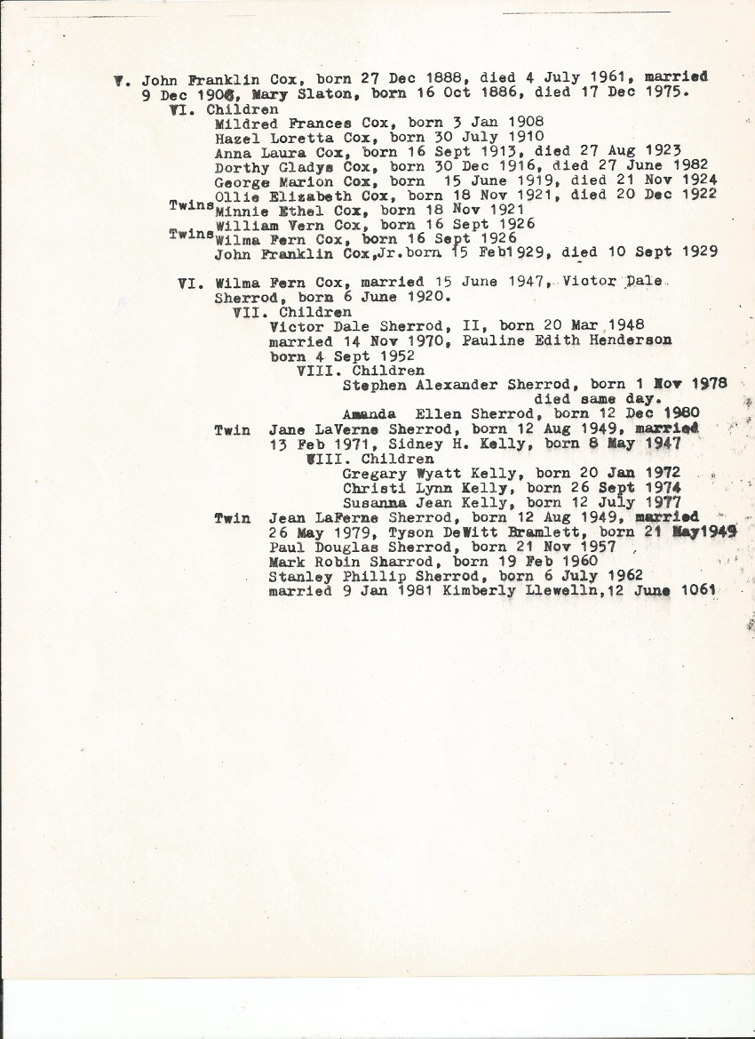 V. John Franklin Cox, born 27 Dec 1888, died 4 July 1961, married