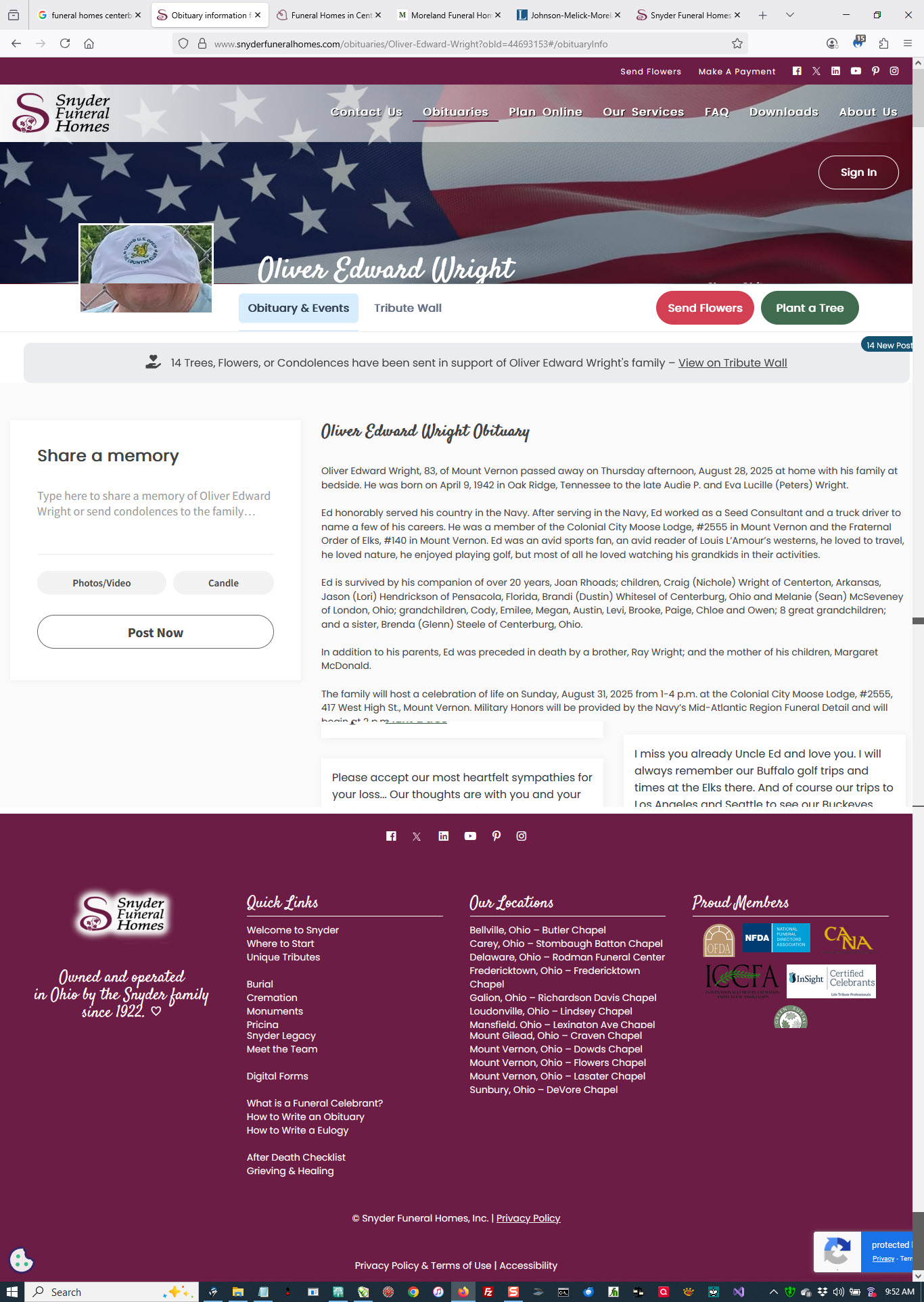 Snyder Funeral Homes web site (many locations near Mt. Vernon, Ohio), Ohio 29 Aug 2025.