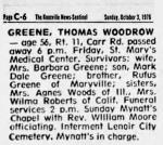 Greene, Thomas Woodrow - age 56, Rt. 11, Carr Rd. passed away 6 p.m. Friday, St. Mary's Medical Center. Survivors: wife, Mrs. Barbara Greene; son, Mark Dale Greene; brother, Rufus Greene of Maryville; sisters, Mrs. Agnes Woods of Ill., Mrs. Wilma Roberts of Calif. Funeral services 2 p.m. Sunday Mynatt's Chapel with Rev. William Moore officiating. Interment Lenoir City Cemetery. Mynatt's in charge.