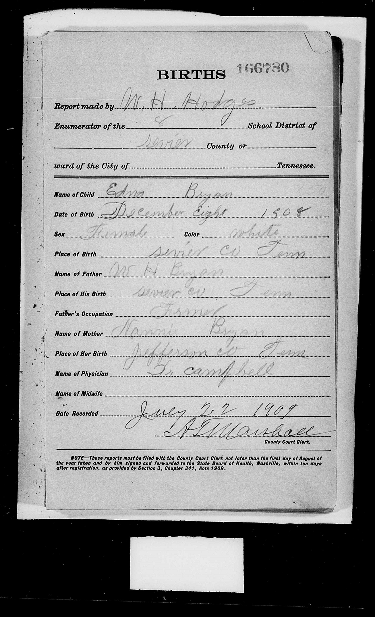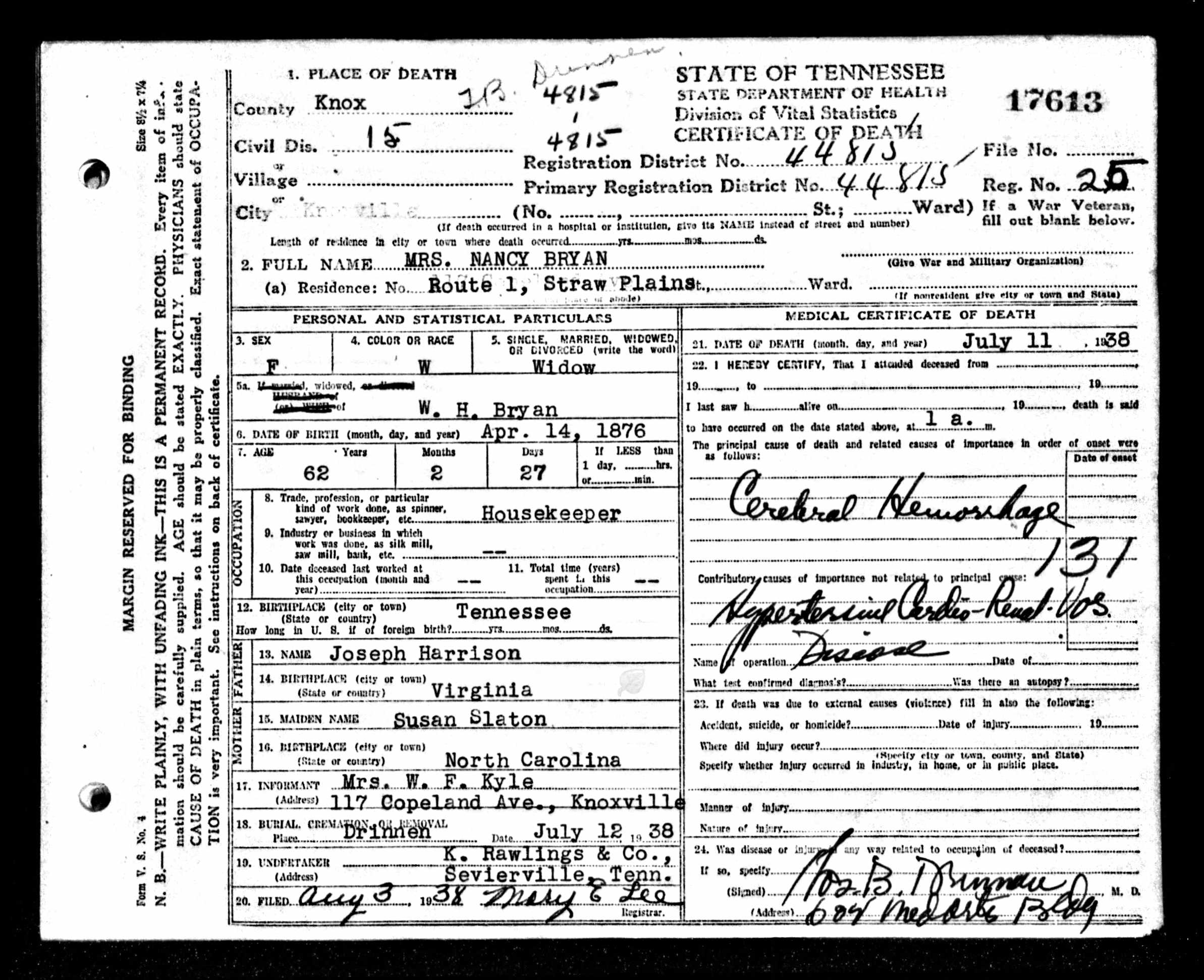 - [S1733] No obituary: Bryan, William Harley; Sevier County Republican [Sevierville, Tennessee], between 15 December 1915 and 29 December 1915.