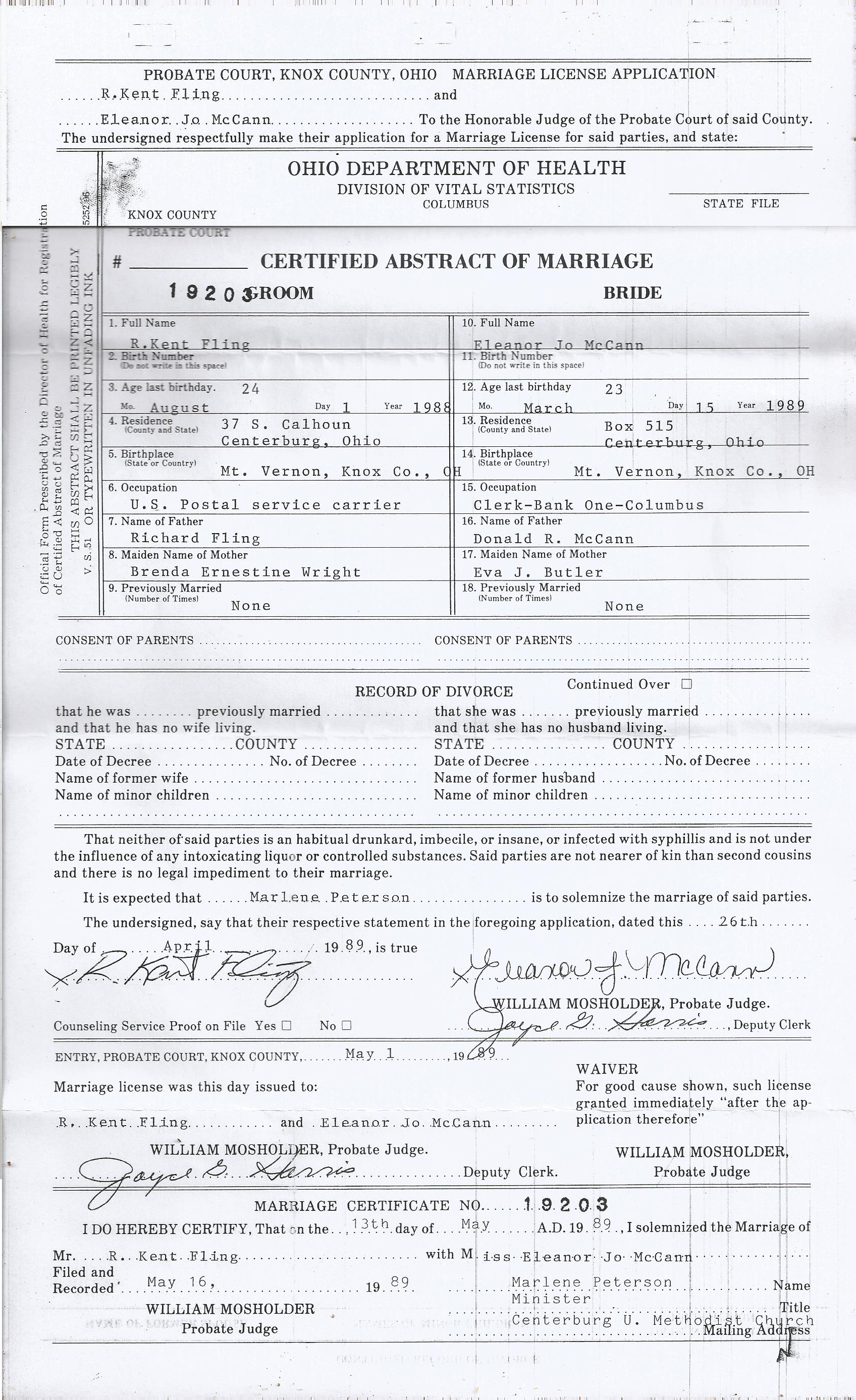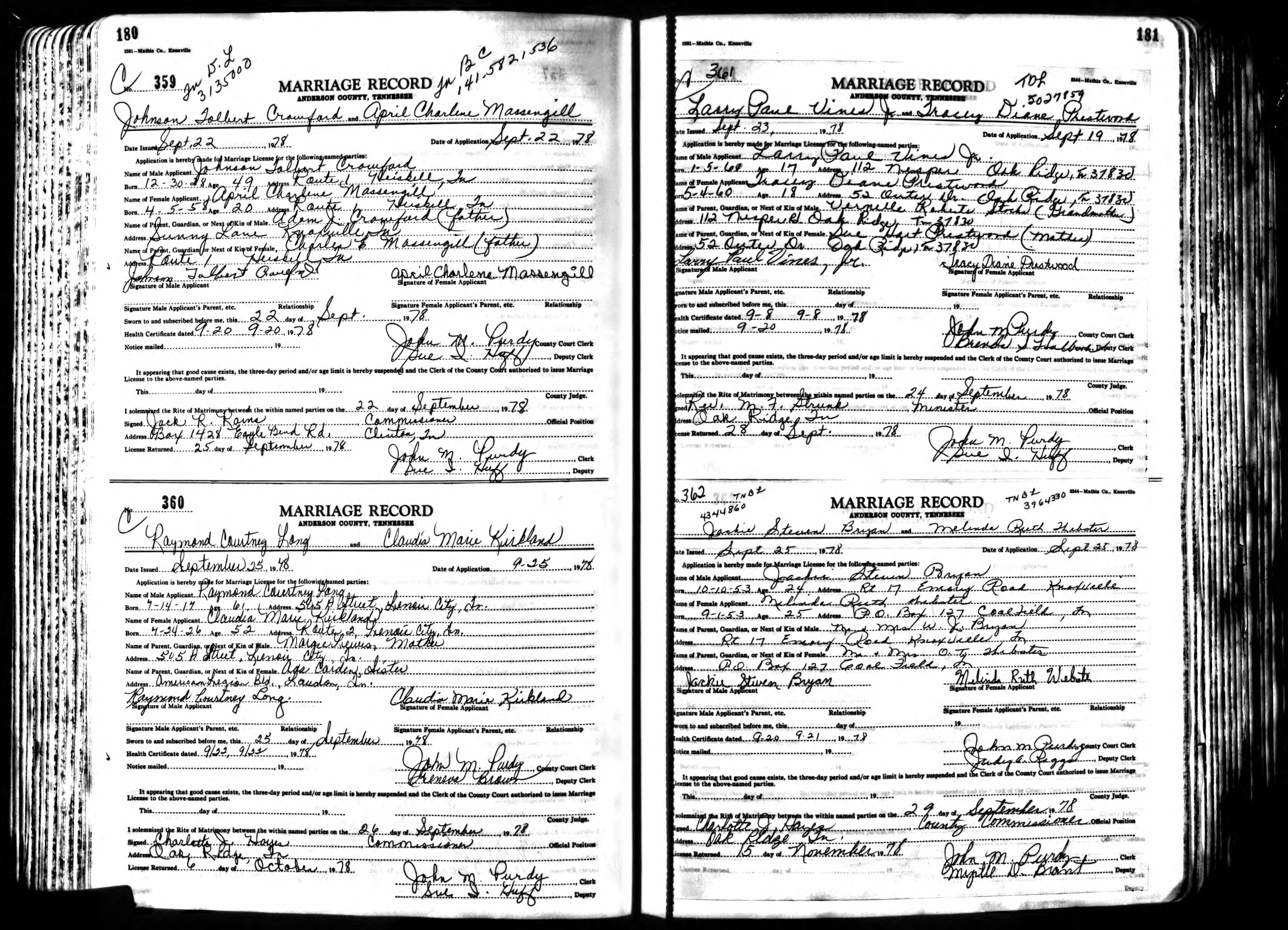 State of Tennessee, Knox County, marriage application #912, book #71, 10-12-1987. Groom - Eric Neal Peters, Rt. 24 Emory Rd, Knoxville, Knox County, TN, born 7-23-67, age 20, white, born in TN, single, 0 previous marriages. Father of groom - James B Peters, born in TN. Mother of groom - Jean Hudson, born in TN. Bride - Tammy Elizabeth Carden, 6625 Ridgeview Rd, Knoxville, Knox County, TN, born 9-30-65, age 22, white, born in TN, single, 0 previous marriages. Father of bride - Leonard W. Carden Jr., born in TN. Mother of bride - Judy Allison, born in TN. Future address - 6629 Ridgeview Rd, Knoxville, TN 37918. I solemnized the Rites of Matrimony between the above parties on the 16 day of October, 1986 (sic), Troy A. Christopher, Minister of the Gospel, 330 Marshall, Clinton, TN 37716. (The marriage was 16 Oct 1987, and there was a typographical error in the Knox County marriage book.)
