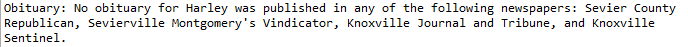 No obituary for Harley was published in any of the following newspapers: Sevier County Republican, Sevierville Montgomery's Vindicator, Knoxville Journal and Tribune, and Knoxville Sentinel. The Sevier County papers were viewed 6/4/2015 and the Knoxville papers were viewed 6/5/2015.
