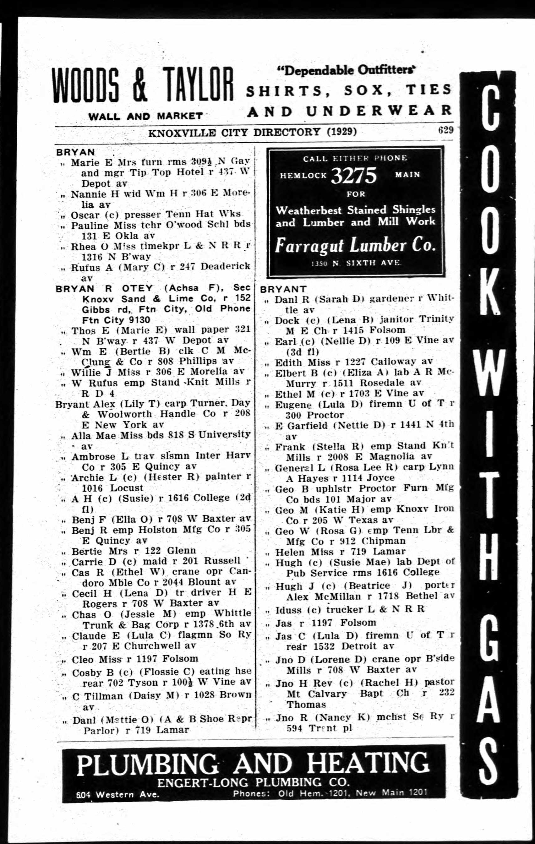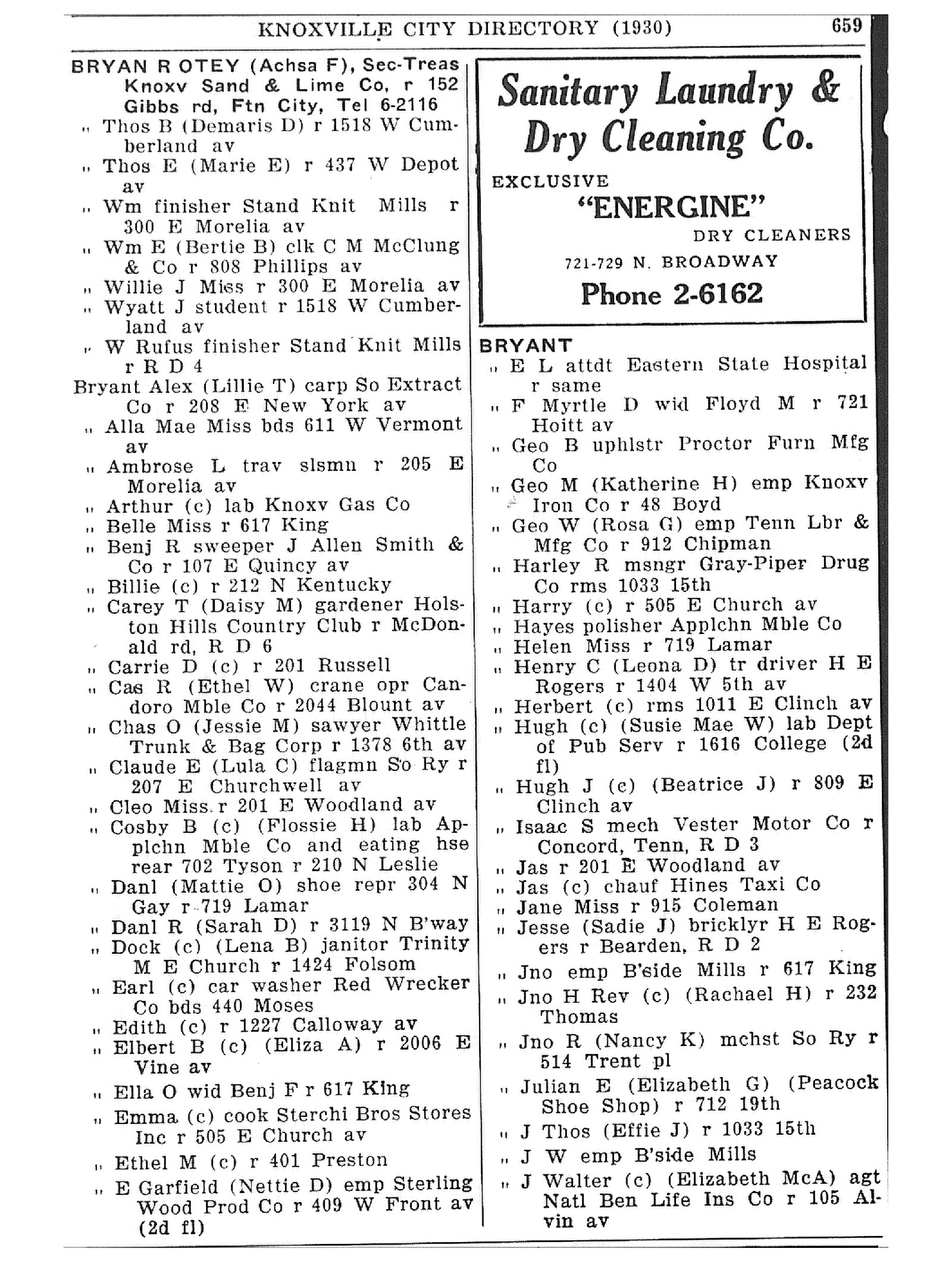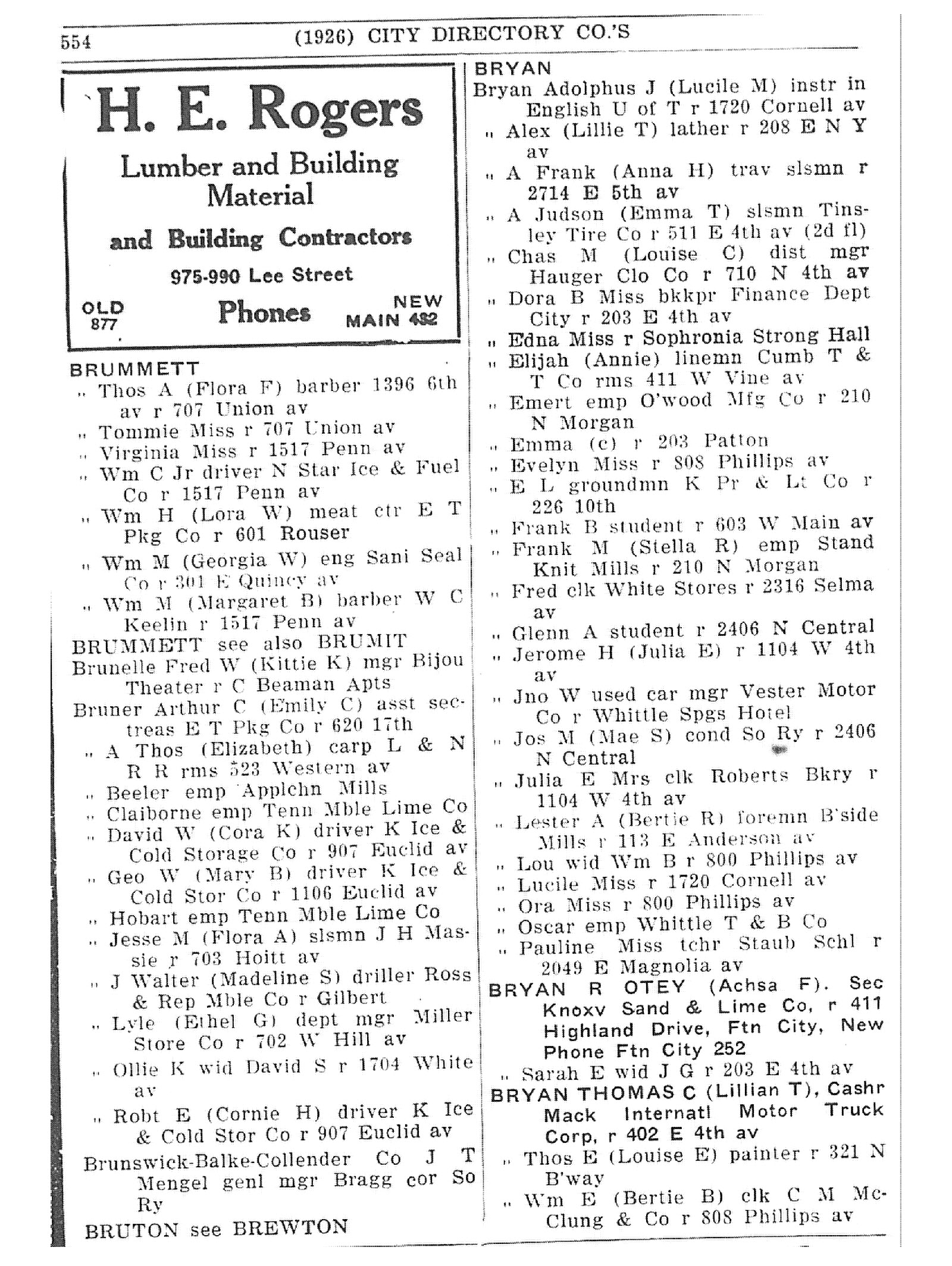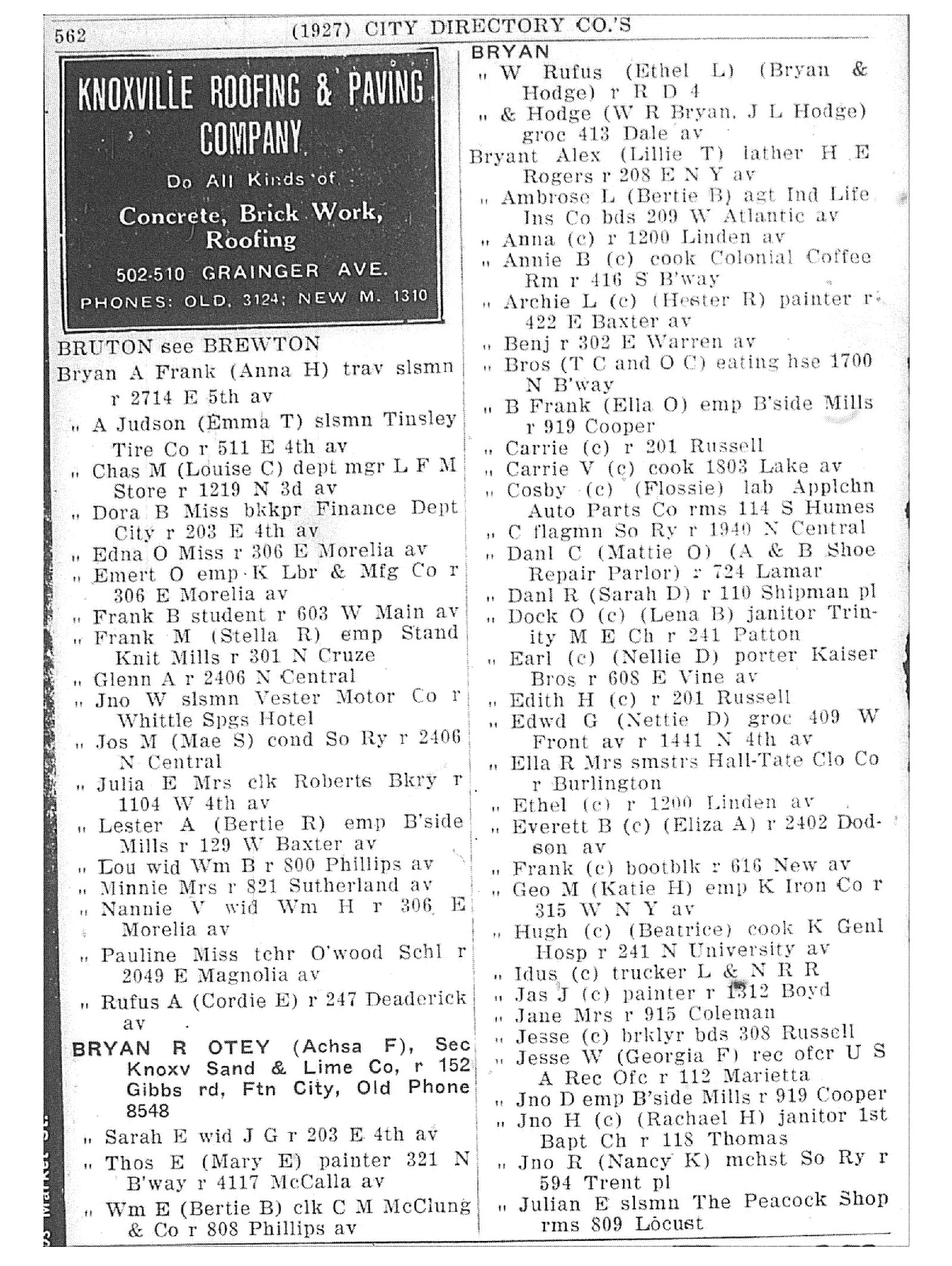 Bryan Bryan R Otey (Achsa F), Sec Knoxv Sand & Lime Co, r 152 Gibbs rd, Ftn City, Old Phone Ftn City 8548.