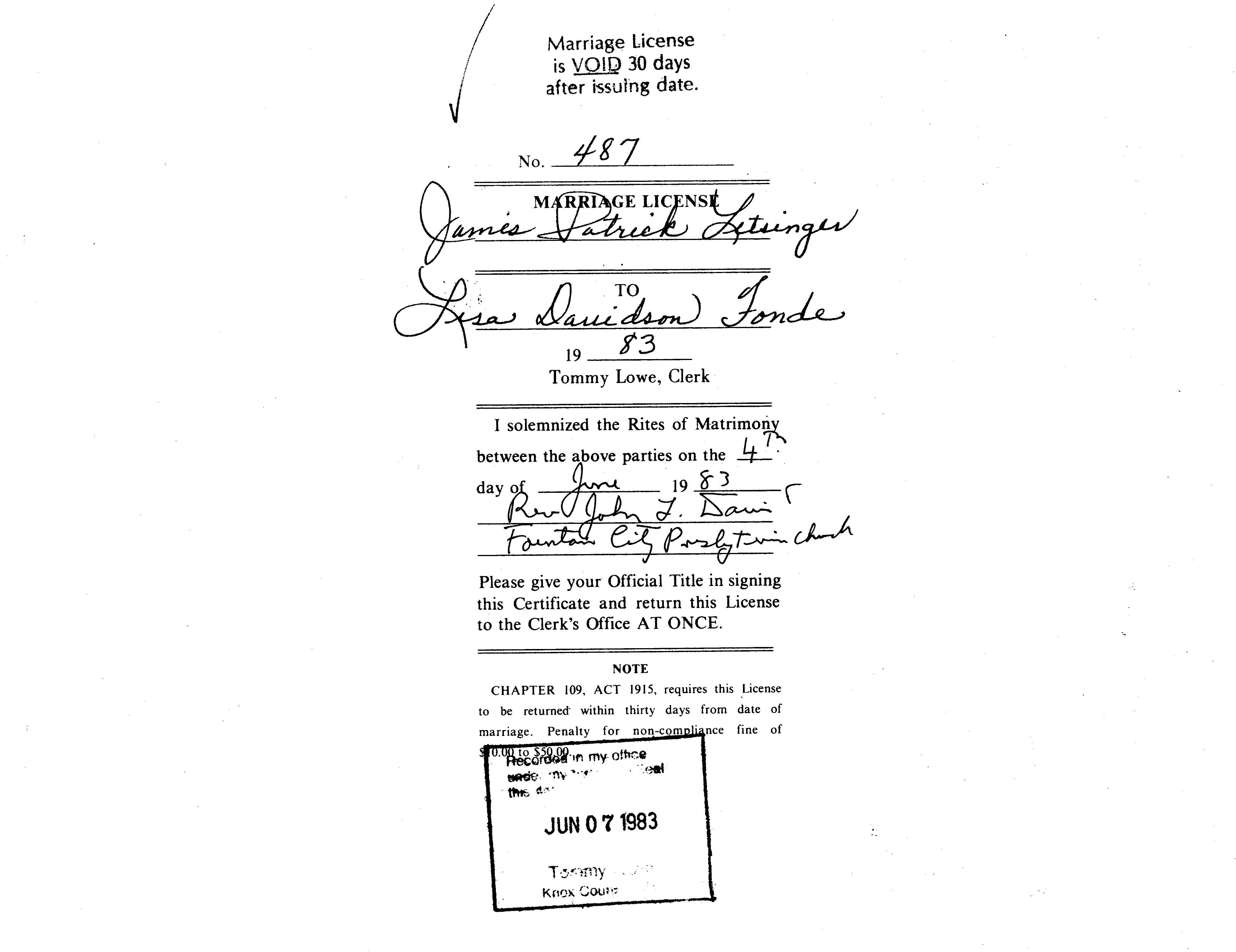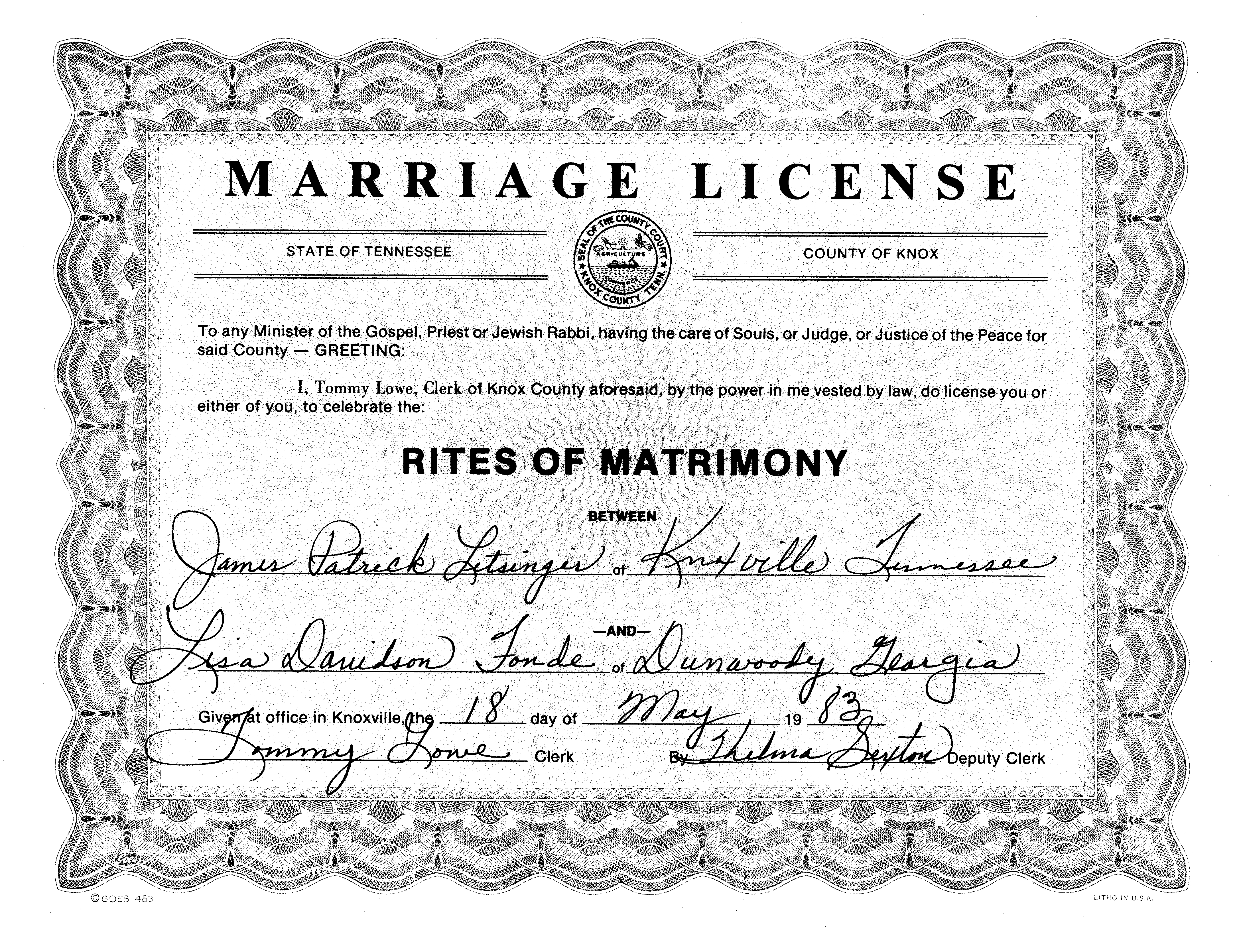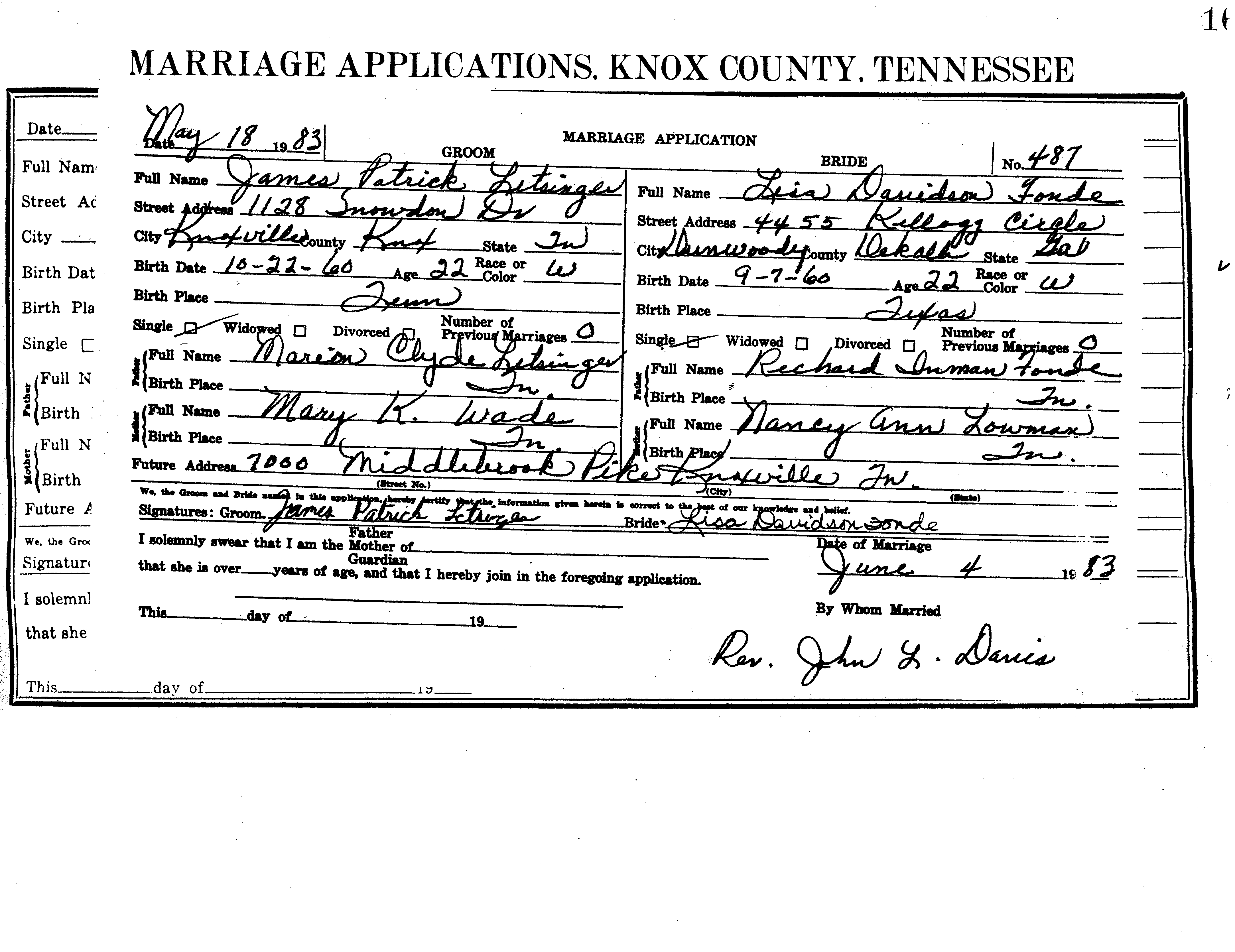 State of Tennessee, Knox County, marriage application 487, May 18, 1983. Groom: Name - James Patrick Letsinger, 1128 Snowden Dr., Knoxville, Knox County, Tn; born - 10-22-60, age 22, white, born in Tenn, single, 0 previous marriages; father - Marion Clyde Letsinger, born in Tn.; mother - Mary K. Wade, born in Tn; bride: Name - Lisa Davidson Fonde, 4455 Kellogg Circle, Dunwoody, Dakalb County, Ga; born - 9-7-60, age 22, white, born in Texas, single, 0 previous marriages; father - Richard Inman Fonde, born in Tn; mother - Nancy Ann Lowman, born in Tn. Future residence - 7000 Middlebrook Pike, Knoxville, Tn. (signed) James Patrick Letsinger, Lisa Davidson Fonde. Date of Marriage - June 4 1983, by Rev. John L. Davis. Marriage License, State of Tennessee, County of Knox. To any Minister of the Gospel, Priest or Jewish Rabbi, having the care of Souls, Judge, or Commissioner for said County - GREETING: I, Tommy Lowe, Clerk of Knox County aforesaid, by the power in me vested by law, do license you or either of you, to celebrate the: RITES OF MATRIMONY BETWEEN James Patrick Letsinger of Knoxville, Tennessee and Lisa Davidson Fonde of Dunwoody, Georgia. Given at office in Knoxville, the 18 day of May 1983. (signed) Tommy Lowe, Clerk, by Thelma Sexton, Deputy Clerk. Marriage License is VOID 30 days after issuing date. If not used please return to Clerk's office. Bk. 089, No. 487, Marriage License, James Patrick Letsinger TO Lisa Davidson Fonde, 1983, Tommy Lowe, Clerk. I solemnized the Rites of Matrimony between the above parties on the 4th day of June, 1983. Rev. John L. Davis, Fountain City Presbyterian Church. (returned JUN 07 1983)