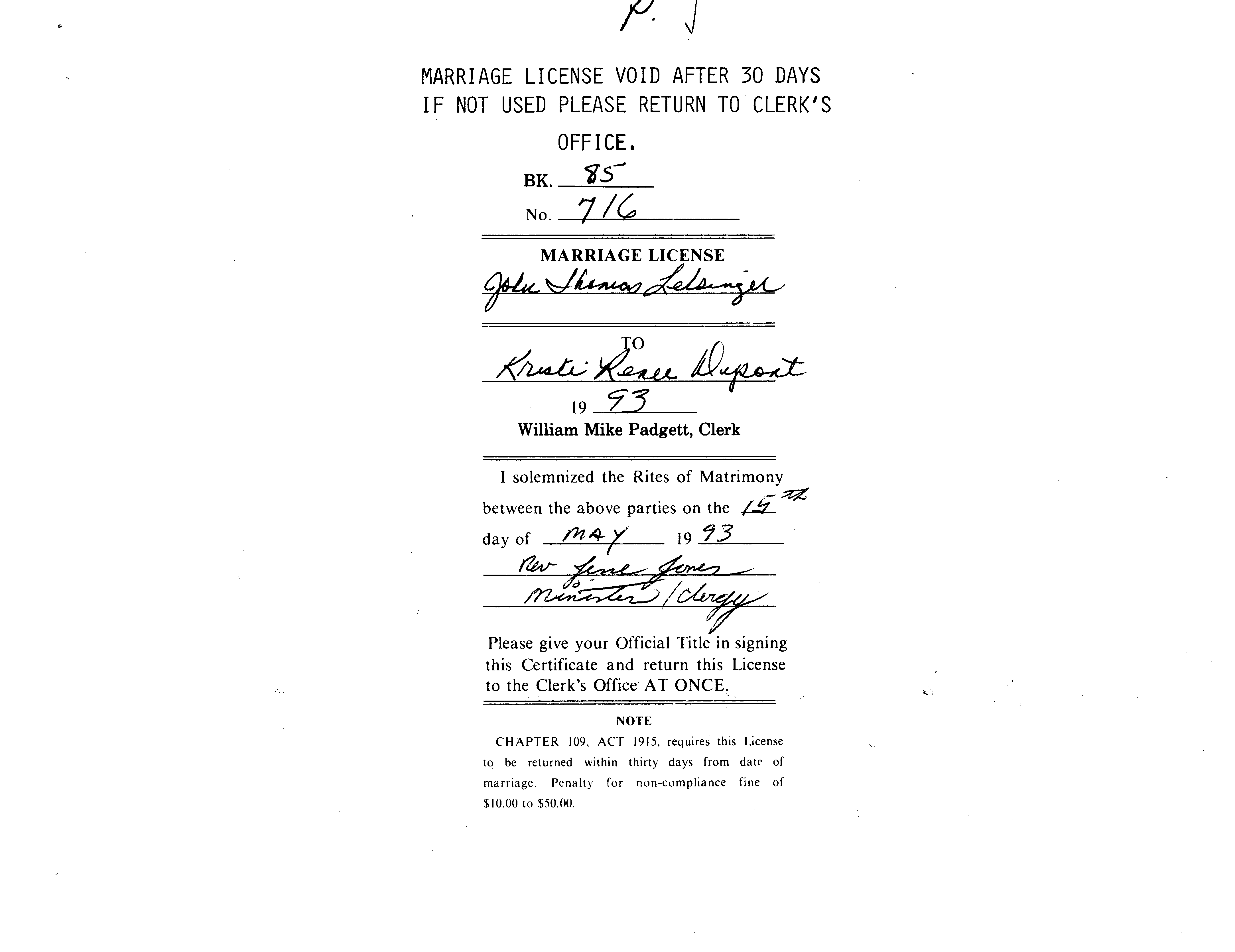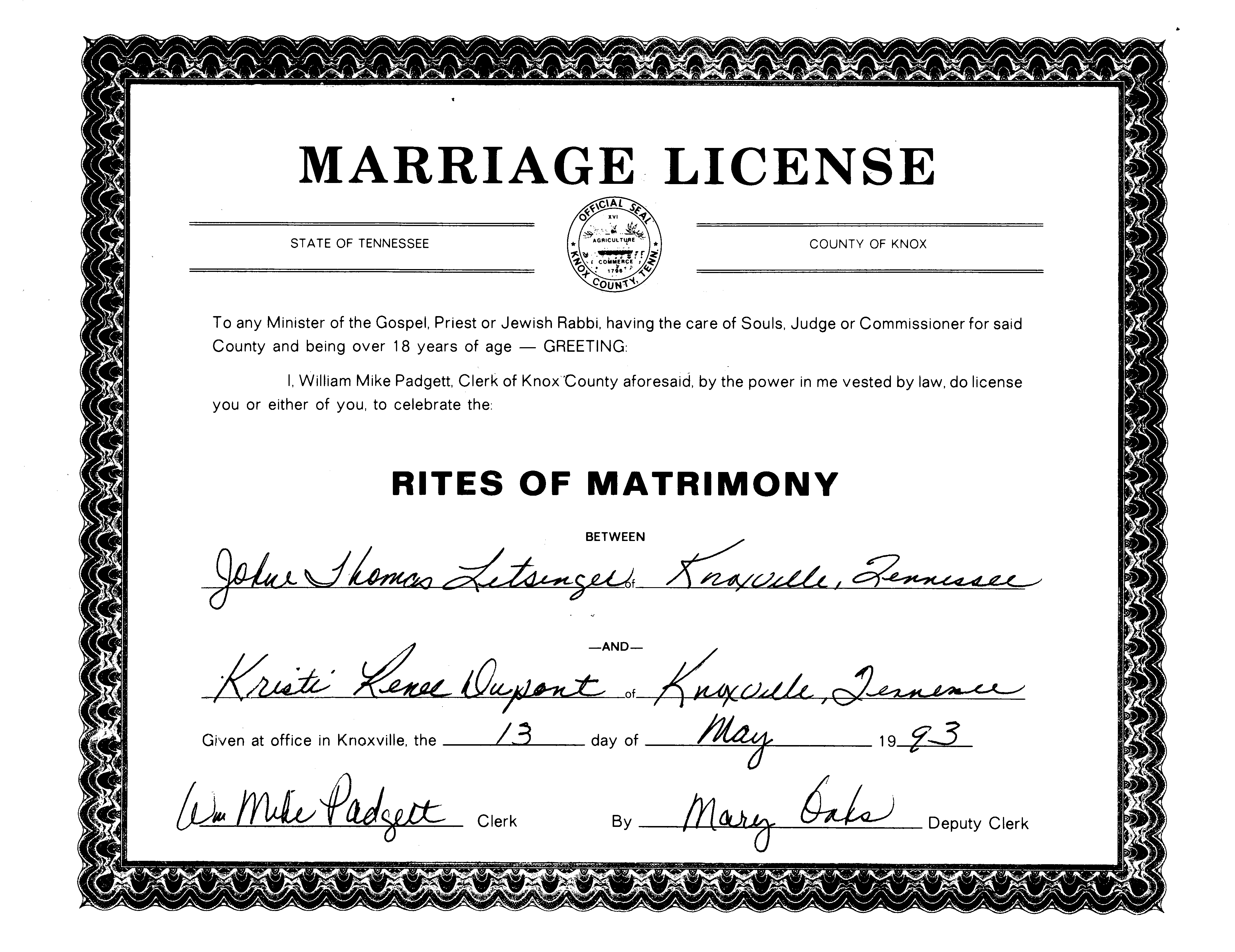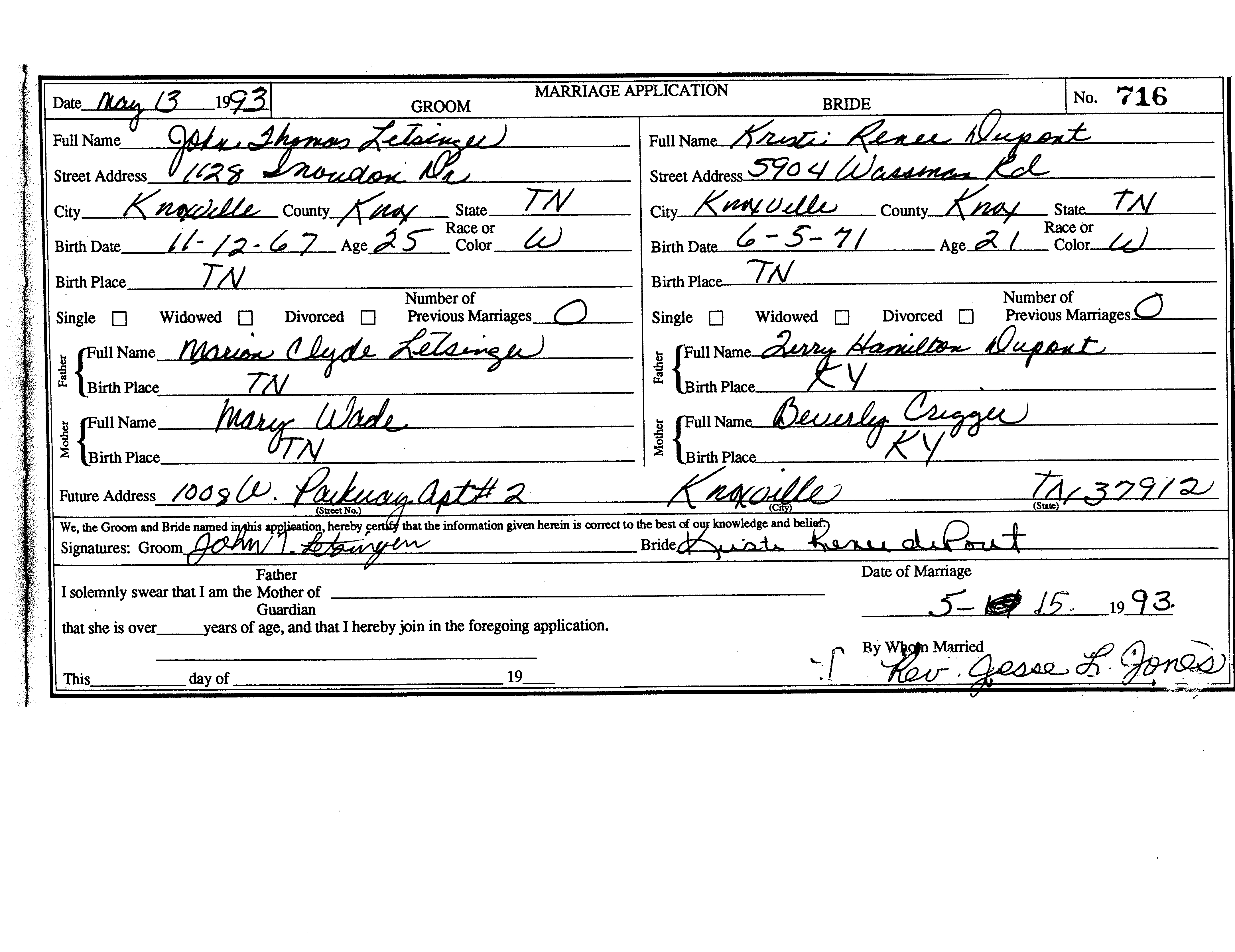 State of Tennessee, Knox County, Book 85, page 238, license #716, May 13, 1993. Groom: Name - John Thomas Letsinger, 1626 Loudon Dr, Knoxville, Knox County, TN; born - 11-12-67, age 25, white, born in TN, single, 0 previous marriages; father - Marion Clyde Letsinger, born in TN; mother - Mary Wade, born in TN; bride: Name - Kristi Renee Dupont, 5904 Wassman Rd, Knoxville, Knox County, TN; born - 6-5-71, age 21, white, born in TN, single, 0 previous marriages; father - Terry Hamilton Dupont, born in KY; mother - Beverly Krigger, born in KY. Future residence - 1008 W. Parkway Apt #2, Knoxville, TN (signed) John M. Letsinger, Kristi Renee Dupont. Date of Marriage - 5-15, 1993, by Rev. Jesse L. Jones. Marriage License, State of Tennessee, County of Knox. To any Minister of the Gospel, Priest or Jewish Rabbi, having the care of Souls, Judge, or Commissioner for said County and being over 18 years of age - GREETING: I, William Mike Padgett, Clerk of Knox County aforesaid, by the power in me vested by law, do license you or either of you, to celebrate the: RITES OF MATRIMONY BETWEEN John Thomas Letsinger of Knoxville, Tennessee and Kristi Renee Dupont of Knoxville, Tennessee. Given at office in Knoxville, the 13 day of May 1993. (signed) Wm. Mike Padgett, Clerk, by Mary Oaks, Deputy Clerk. Marriage License is VOID 30 days after issuing date. If not used please return to Clerk's office. Bk. 85, No. 716, Marriage License, John Thomas Letsinger TO Kristi Renee Dupont, 1993, William Mike Padgett, Clerk. I solemnized the Rites of Matrimony between the above parties on the 19th day of May, 1993. Rev. Jesse Jones, minister/clergy.