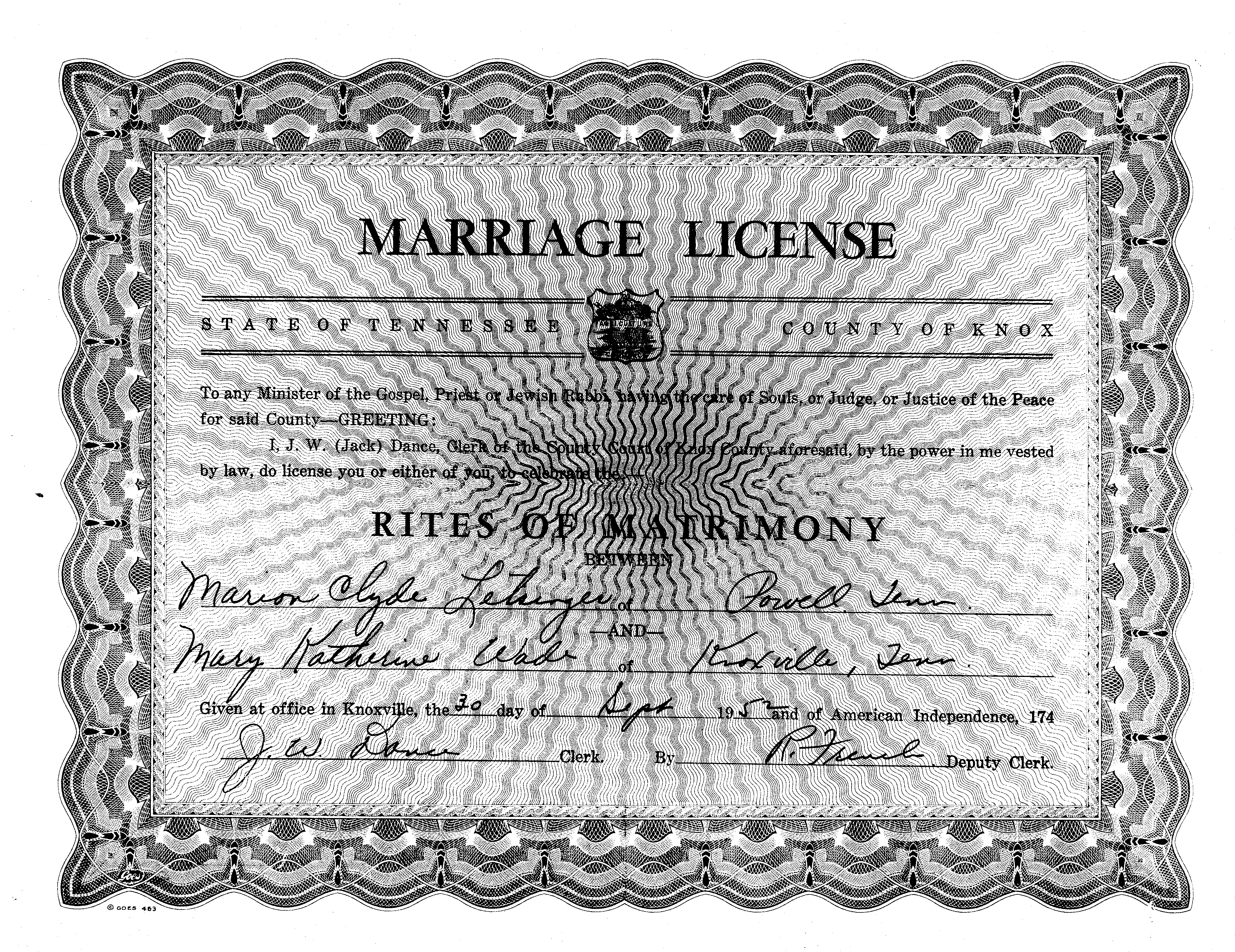 Date - Sept 30, 1952. Marriage Application #1297, page 433. Groom: Name - Marion Clyde Letsinger, Powell, Knox County, Tenn; born - Aug 31, 1928, age 24, white, born in Knoxville, Tennessee, single, 0 previous marriages; father - Samuel M. Letsinger, born in Tenn.; mother - Elza C. Peters, born in Tenn.; Bride: Name - Mary Katherine Wade, 5831 Central Ave. Pike, Knoxville, Knox County, Tenn; born - Oct 20, 1929, age 22, white, born in Knoxville, Tenn., single, 0 previous marriages; father - Clarence E. Wade, Sr., born in Tenn.; mother - Katherine Agnes Millett, born in Tenn. Future Address - 5831 Central Ave. Pk., Knoxville, Tenn. We, the Groom and Bride named in this application, hereby certify that the information given herein is correct to the best of our knowledge and belief. (signed) Marion Clyde Letsinger, Mary Katherine Wade. Date of Marriage - Oct 4th, 1952 by Jas. P. Fallman M.G. Marriage License, State of Tennessee, County of Knox. To any Minister of the Gospel, Priest or Jewish Rabbi, having the care of Souls, or Judge, or Justice of the Peace for said County - GREETING: I, J. W. (Jack) Dance, Clerk of the County Court of Knox County aforesaid, by the power in me vested by law, do license you or either of you, to celebrate the: RITES OF MATRIMONY BETWEEN Marion Clyde Letsinger of Powell, Tenn and Mary Katherine Wade of Knoxville, Tenn. Given at office in Knoxville, the 30 day of Sept. 1952. (signed) J. W. Dance Clerk. By R. French, Deputy Clerk. No. 1297, Marriage License, Marion Clyde Letsinger TO Mary Katherine Wade, 1952, J. W. (Jack) Dance, Clerk. I solemnized the Rites of Matrimony between the above parties on the 4 day of October, 1952. Jas. P. Fallman, Pastor.