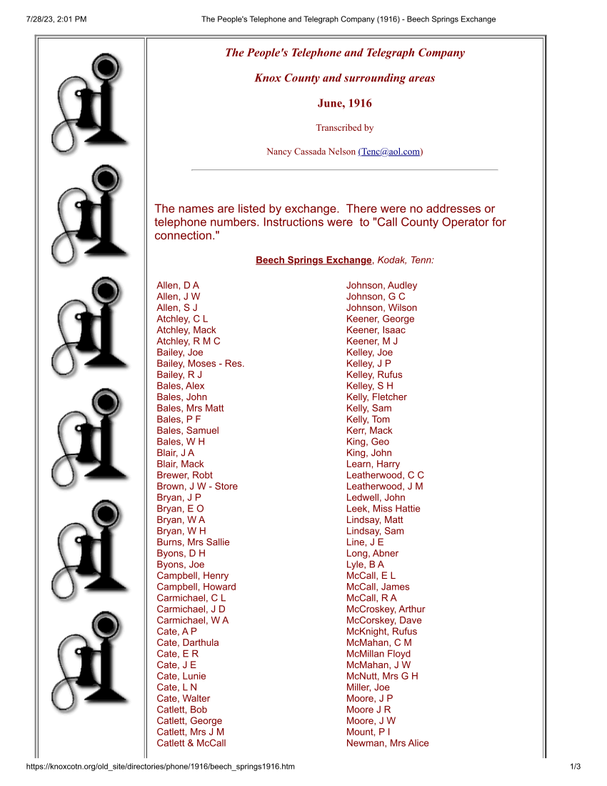 - [S1507] City Directory: Knoxville, Tennessee, 1930, page 658, viewed at ancestry.com (U.S. City Directories, 1821-1989) on 31 March 2014.
