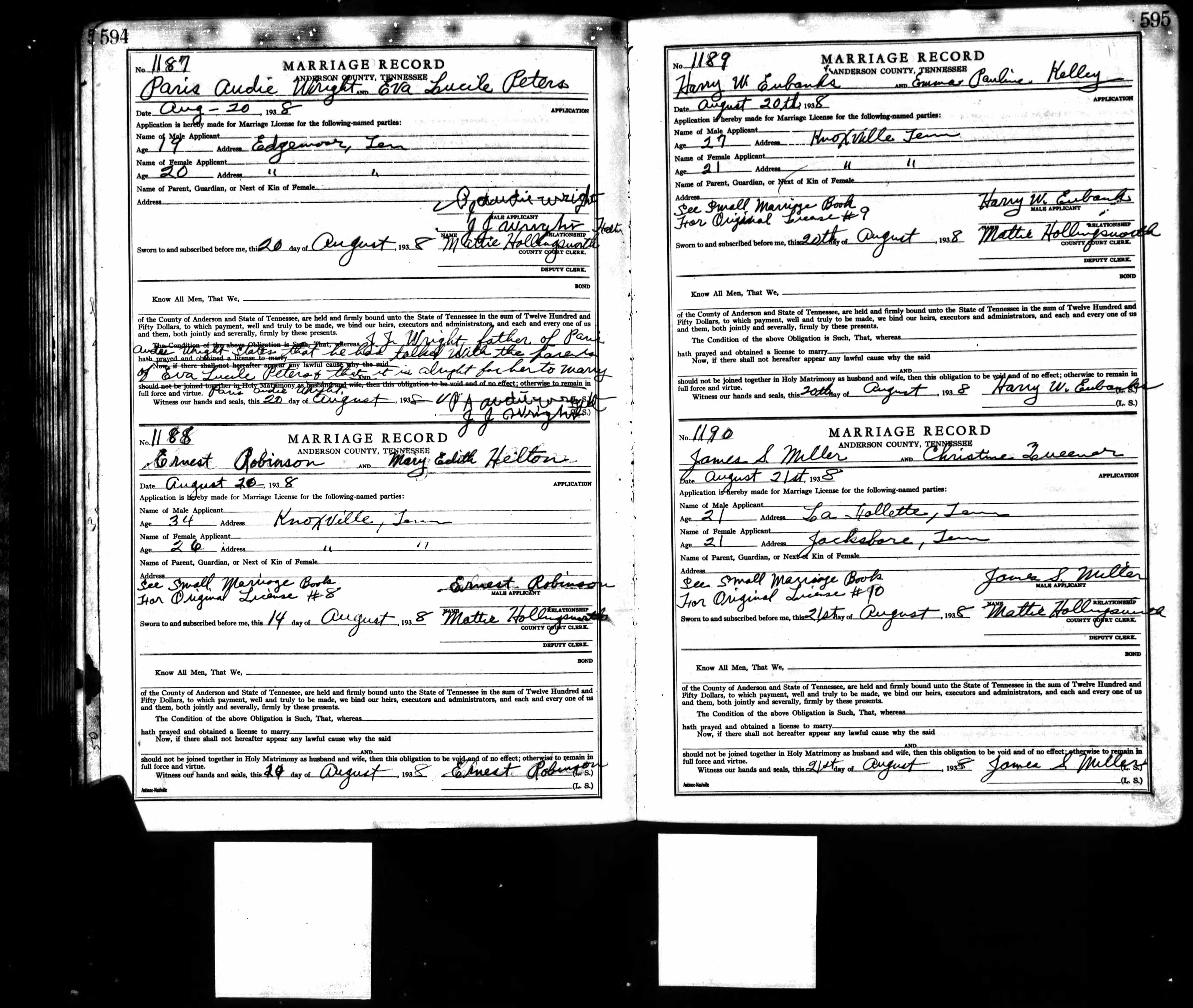 License 1187, Marriage Record, Anderson County, Tennessee, Paris Audie Wright and Eva Lucile Peters, Date: Aug - 20, 1928, Application is hereby made for Marriage License for the following-named parties: Male Applicant age 19, Edgemoor, Tenn; Female Applicant age 20, Edgemoore, Tenn; Signed: P. Audie Wright, J. J. Wright, father, Sworn and subscribed before me, this 20 day of August, 1938, Mattie Hollingsworth, County Court Clerk. Know All Men, that We, of the County of Anderson and State of Tennessee, are held and firmly bound unto the State of Tennessee in the sum of Twelve Hundred and Fifty Dollars, to which payment, well and truly be made, we bind our heirs, executors and administrators, and each and every one of us and them, both jointly and severally, firmly by these presents. J. J. Wright, father of Paris Audie Wright states that he has talked with the parents of Eva Lucile Peters & that it is alright for her to marry Paris Audie Wright. Witness our hands and seals, this 20 day of August, 1938, Signed P Audie Wright, J. J. Wright. (second entry) License 1187; 1938 Aug 20; Paris Audie Wright to Eva Lucile Peters; I solemnized the Rites of Matrimony between the within named parties on the 20th day of August, 1938, Rev. J. D. Babb, pastor, Oliver Springs Methodist Church.