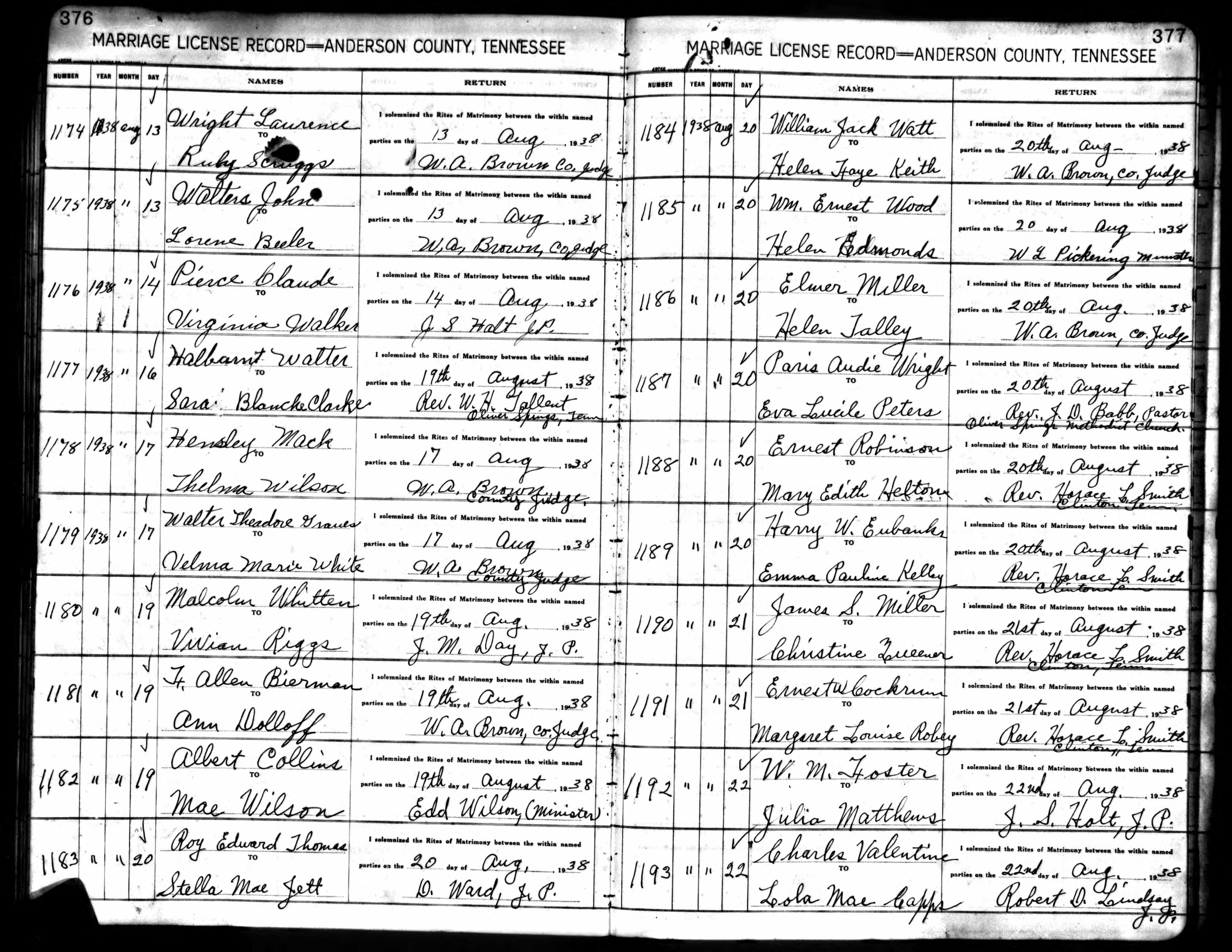 - [S1541] Marriage Record: Blount County, Tennessee, 1934; License 88; William Birchell Peters and Anna Jo Hackworth.