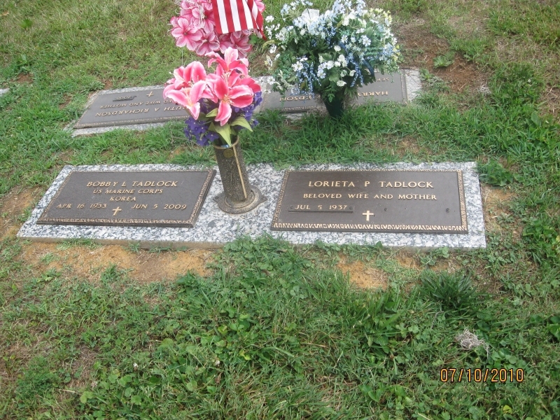 Grave marker: Bobby L Tadlock, US Marine Corps, Korea, Apr 16 1933- Jun 5 2009.