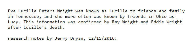 Eva Lucille Peters Wright was known as Lucille to friends and family in Tennessee, and she more often was known by friends in Ohio as Lucy. This information was confirmed by Ray Wright and Eddie Wright after Lucille's death.