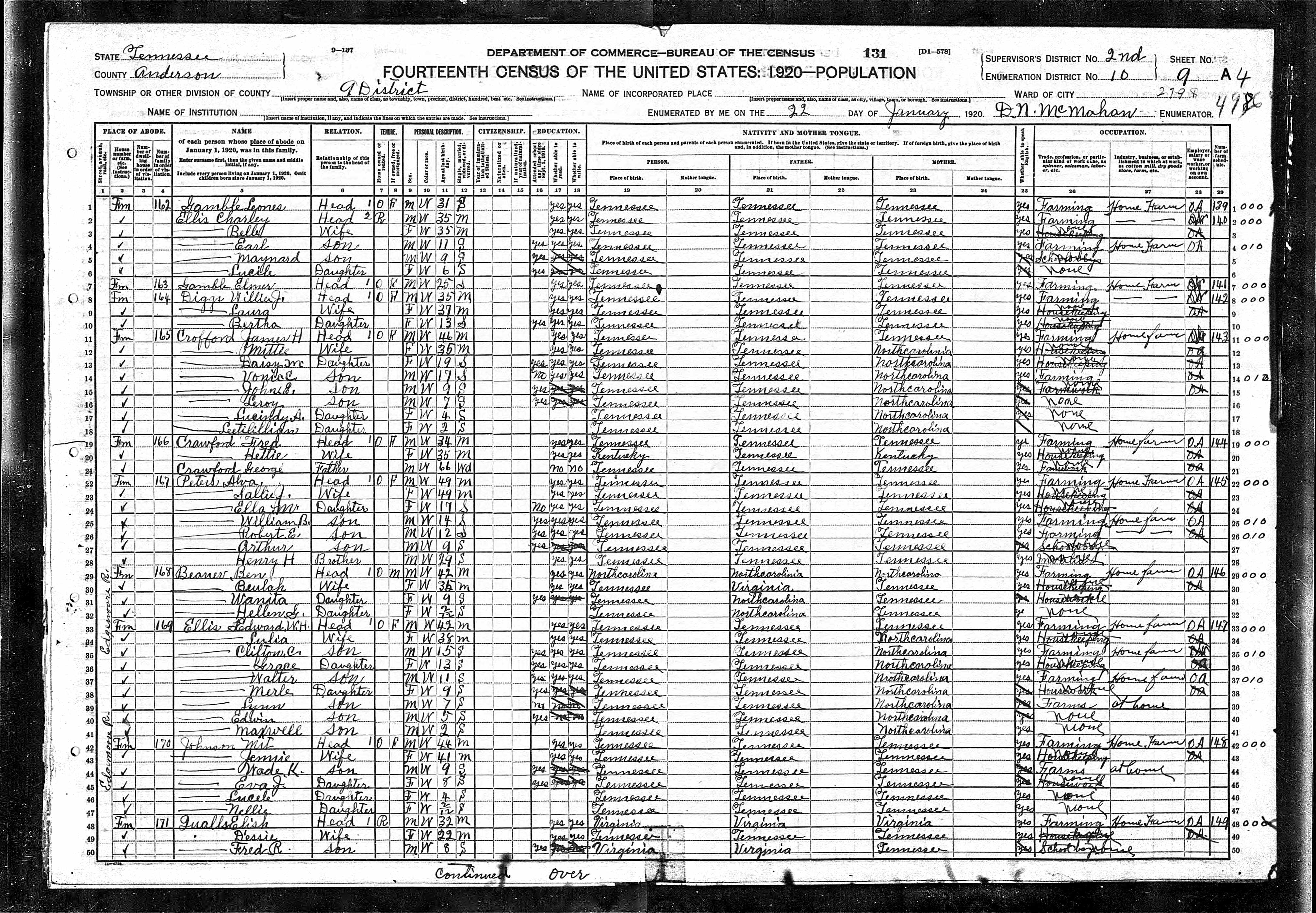- [S2232] U.S. Federal Census: 1920, Anderson County, Tennessee, Enumeration District 10, Dist. 9, page 129a, ancestry.com (1920 U.S. Census) viewed on 15 December 2016.