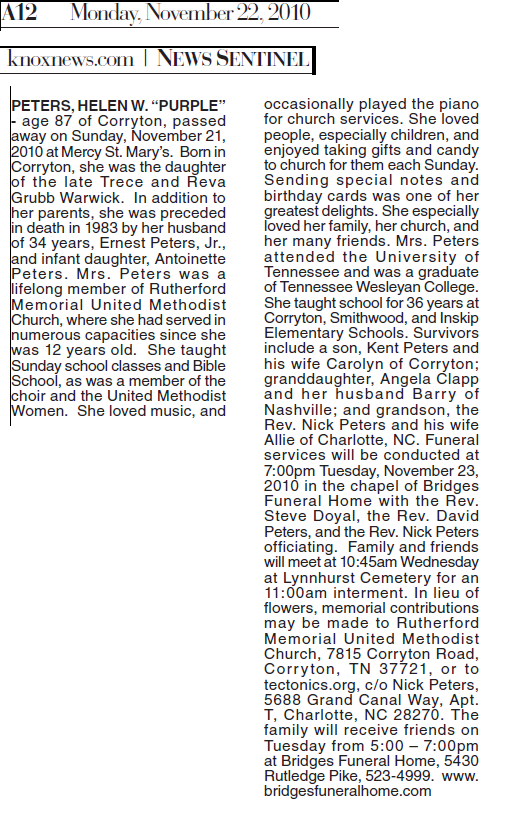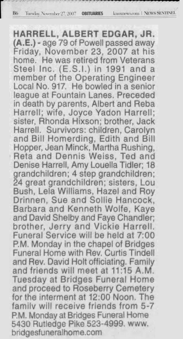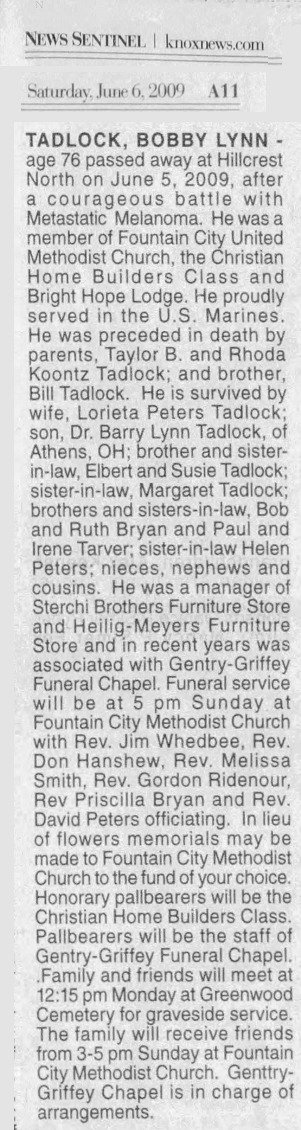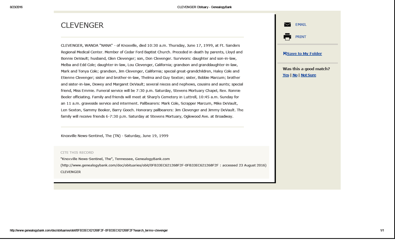 - [S2023] Obituary: Cole, Thomas Edward; Knoxville News-Sentinel [Knoxville, Tennessee], 27 December 2007, newspaper page unknown, viewed at www.genealogybank.com on 19 December 2015.