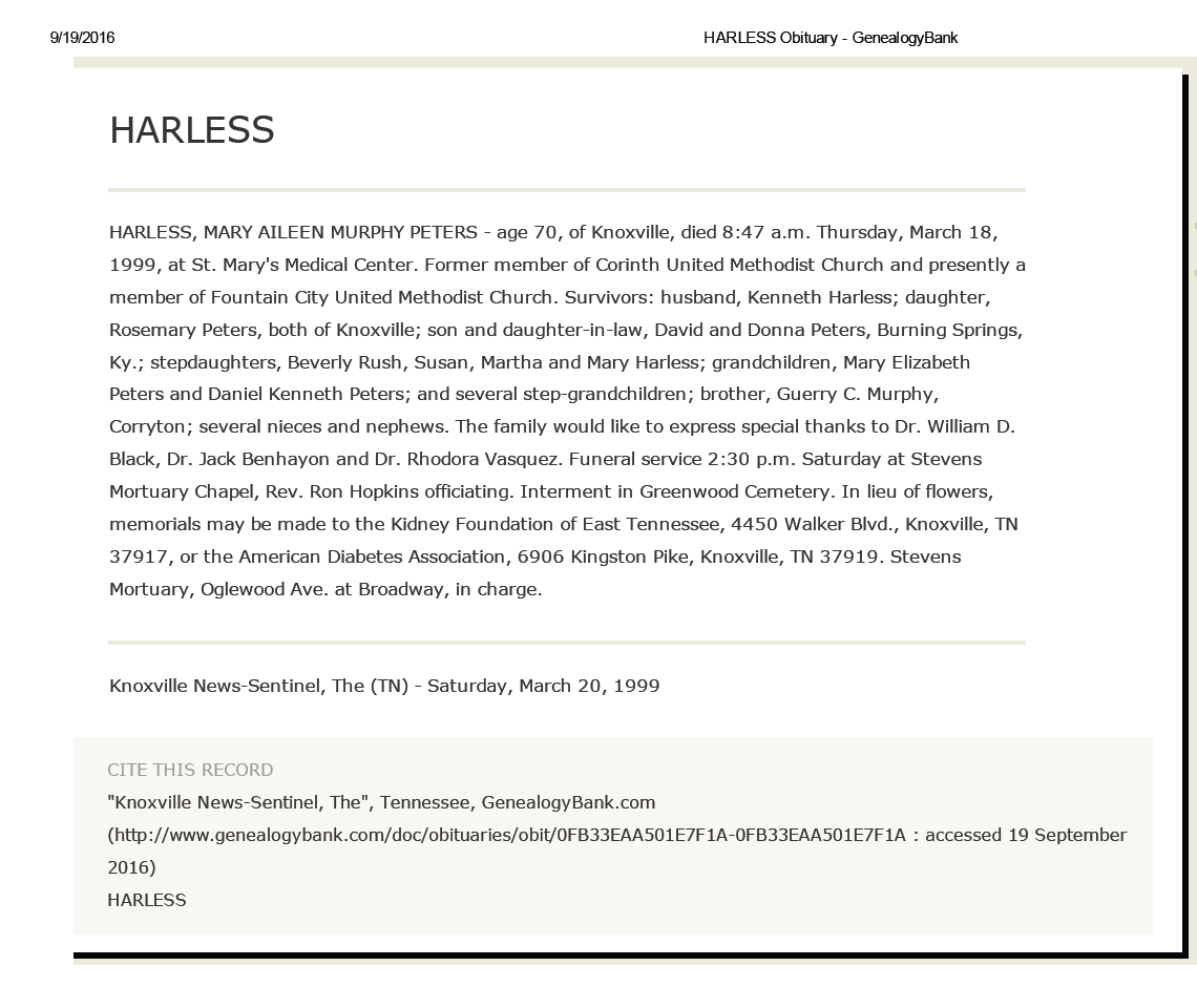 - [S2007] Grave marker: Mary Aileen Peters; Greenwood Cemetery, Knoxville, Knox County, Tennessee; photographed 15 September 2013 by Jerry Bryan.