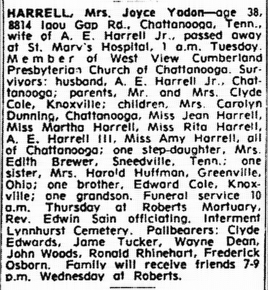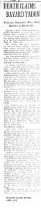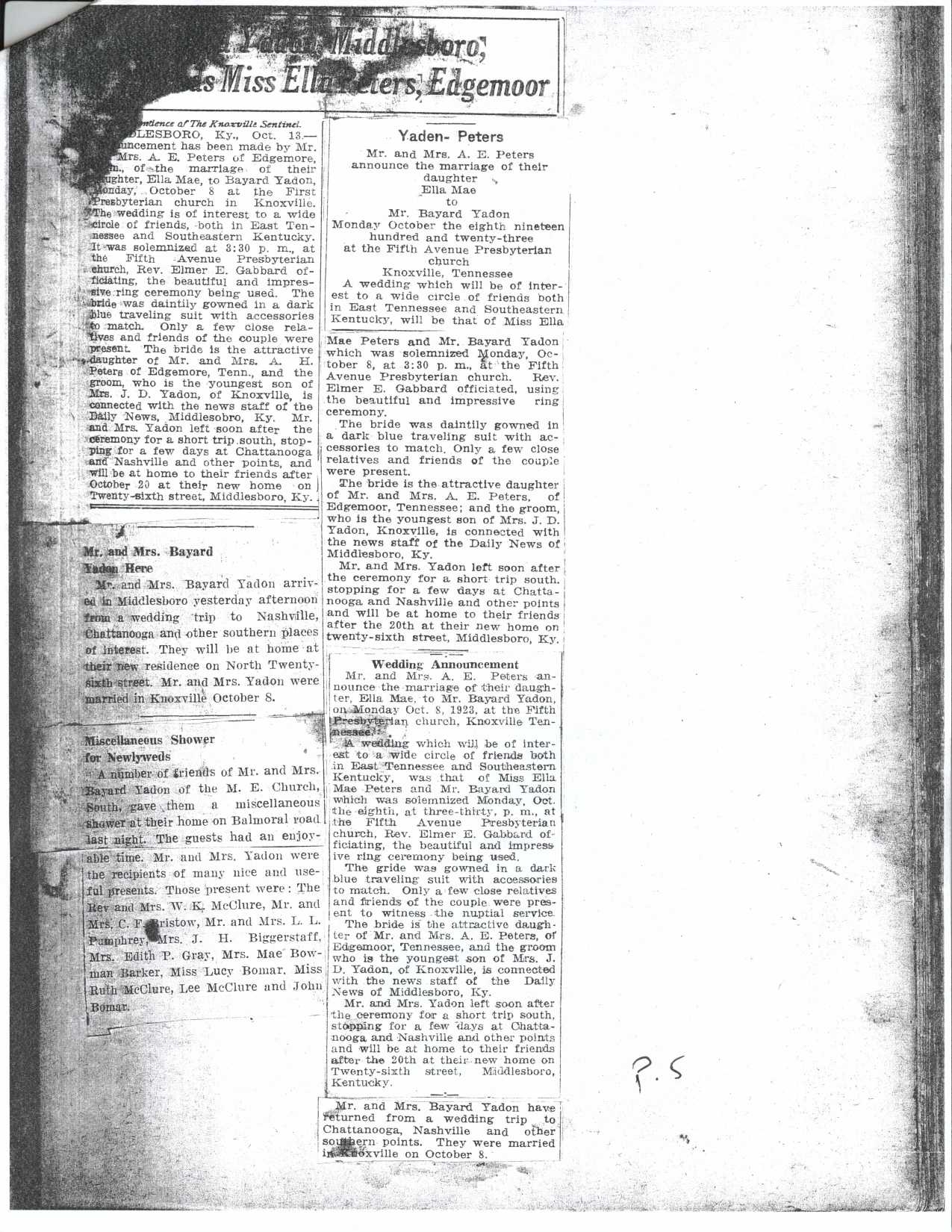 - [S2015] Obituary: Yadon, Bayard; Knoxville News-Sentinel [Knoxville, Tennessee], 26 September 1933, page 7.