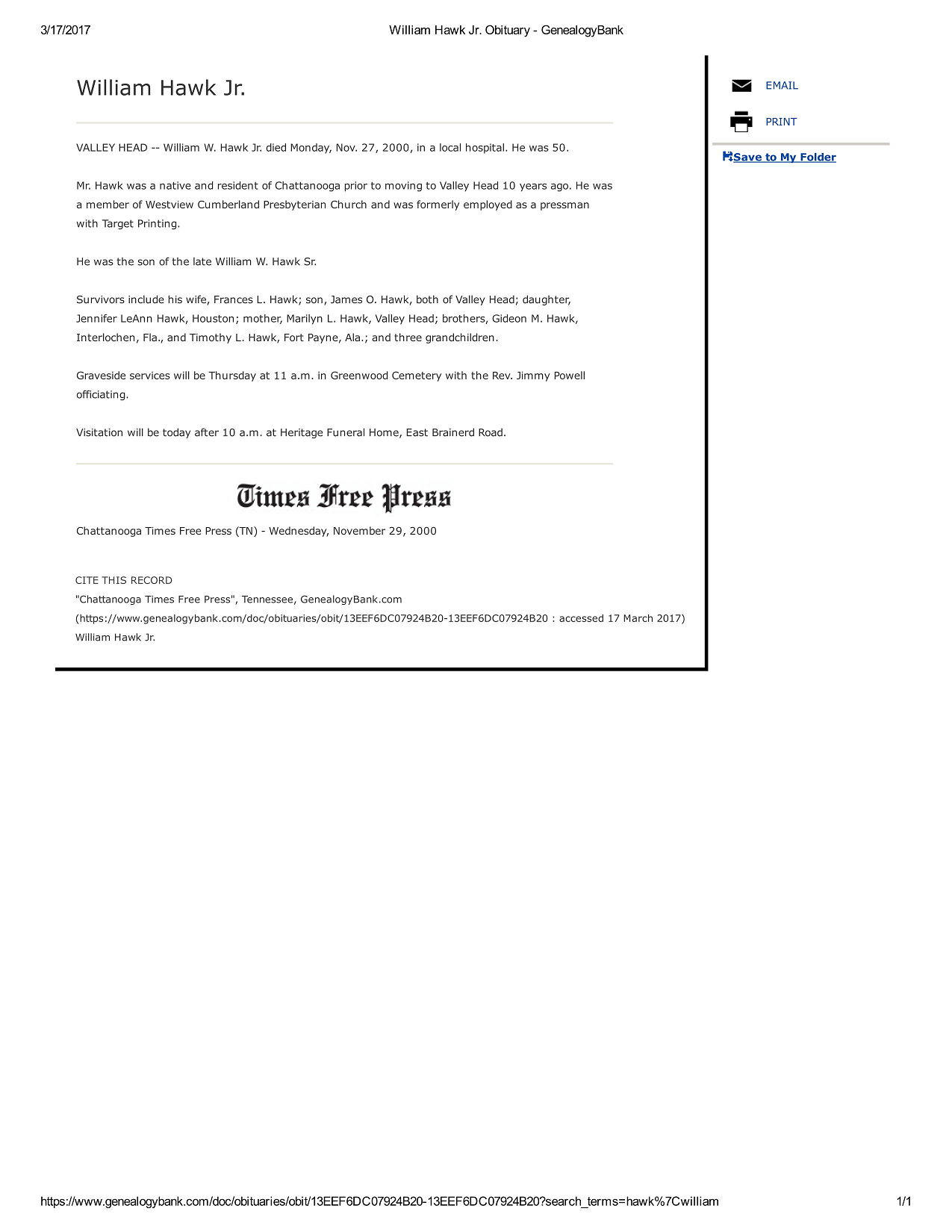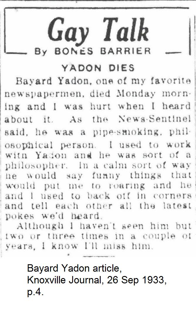 - [S2013] Obituary: Yadon, Bayard; Gay Talk by Bones Barrier, Knoxville Journal [Knoxville, Tennessee], 26 September 1933, page 4.