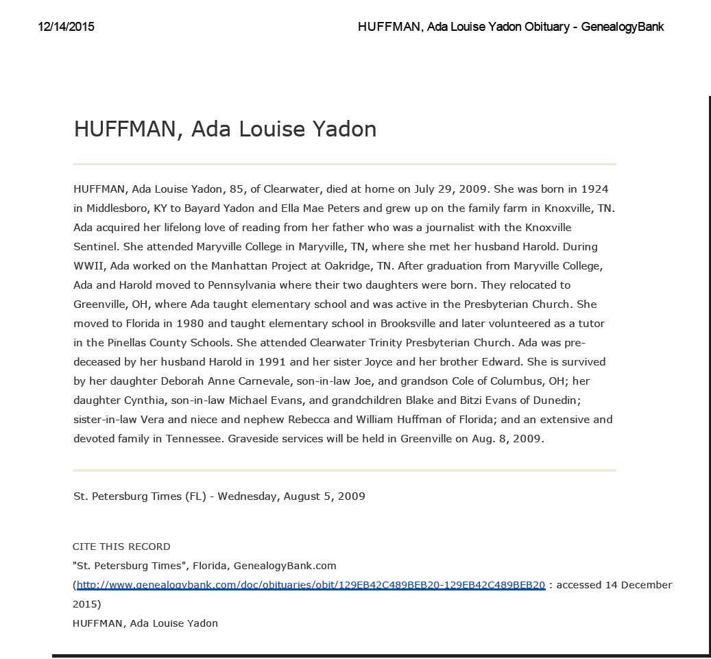 Huffman, Ada Louise Yadon, 85, of Clearwater, died at home on July 29, 2009. She was born in 1924 in Middlesboro, KY to Bayard Yadon and Ella Mae Peters and grew up on the family farm in Knoxville, TN. Ada acquired her lifelong love of reading from her father who was a journalist with the Knoxville Sentinel. She attended Maryville College in Maryville, TN, where she met her husband Harold. During WWII, Ada worked on the Manhattan Project at Oakridge, TN. After graduation from Maryville College, Ada and Harold moved to Pennsylvania where their two daughters were born. They relocated to Greenville, OH, where Ada taught elementary school and was active in the Presbyterian Church. She moved to Florida in 1980 and taught elementary school in Brooksville and later volunteered as a tutor in the Pinellas County Schools. She attended Clearwater Trinity Presbyterian Church. Ada was pre-deceased by her husband Harold in 1991 and her sister Joyce and her brother Edward. She is survived by her daughter Deborah Anne Carnevale, son-in-law Joe, and grandson Cole of Columbus, OH; her daughter Cynthia, son-in-law Michael Evans, and grandchildren Blake and Bitzi Evans of Dunedin; sister-in-law Vera and niece and nephew Rebecca and William Huffman of Florida; and an extensive and devoted family in Tennessee. Graveside services will be held in Greenville on Aug. 8, 2009.