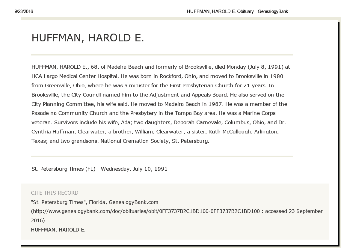 - [S2017] Obituary: Huffman, Ada Louise Yadon; St. Petersburg Times [St. Petersburg, Florida], 5 August 2009, viewed at www.genealogybank.com on 14 December 2015.