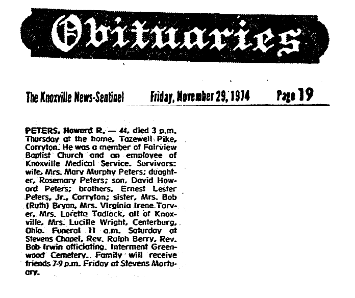 - [S2003] Grave marker: Howard R. Peters; Greenwood Cemetery, Knoxville, Knox County, Tennessee; photographed 15 September 2013 by Jerry Bryan.