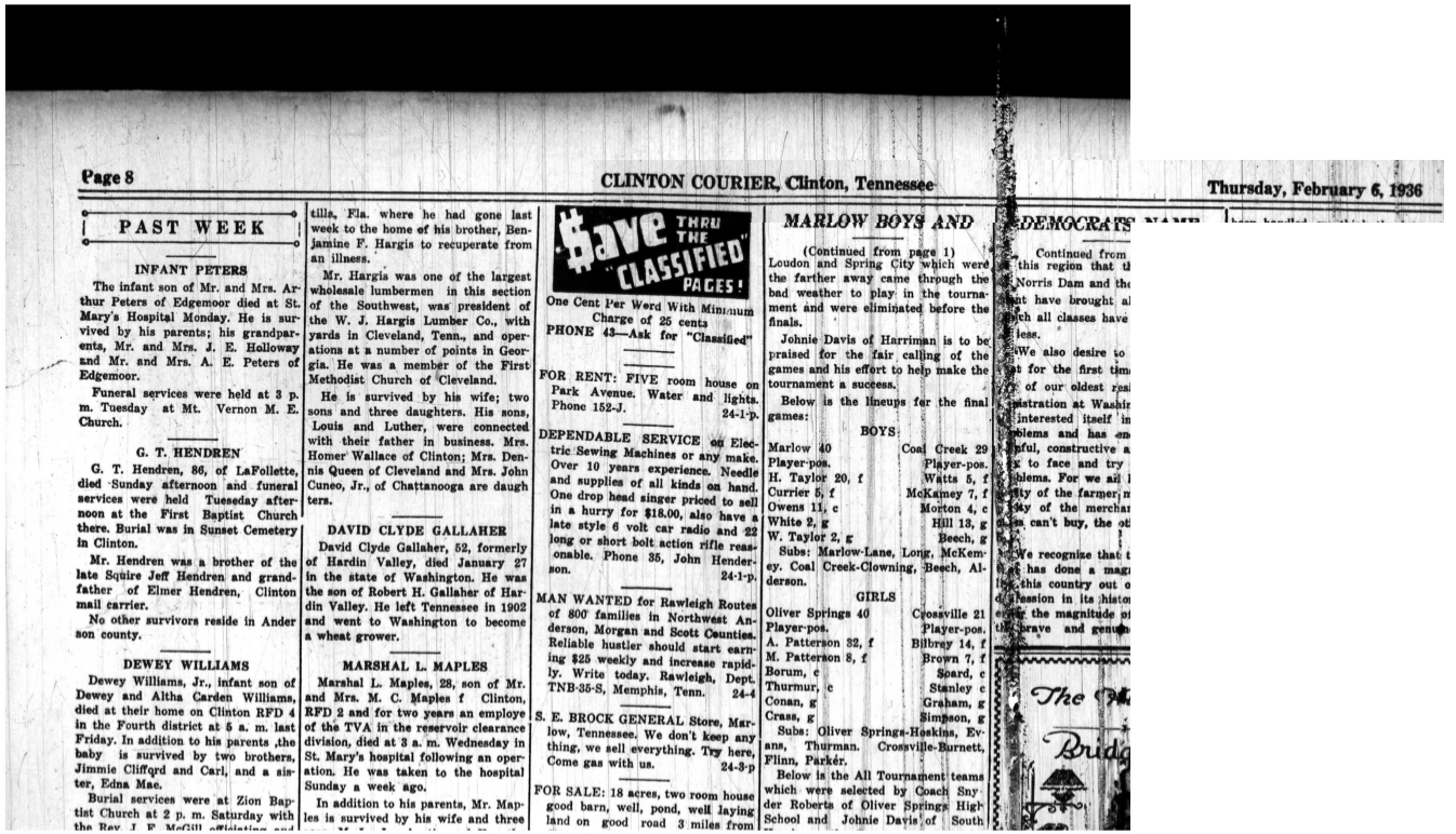 - [S2018] City Directory: Knoxville, Tennessee, 1936, page 691, viewed at www.ancestry.com on 14 December 2015.
