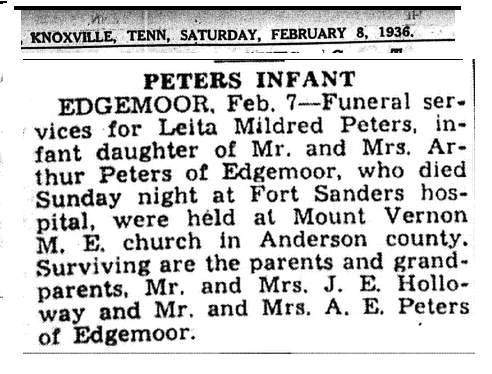 - [S2234] U.S. Federal Census: 1930, Anderson County, Tennessee, Enumeration District 1-12, Dist. 9, page 126b, ancestry.com (1930 U.S. Census) viewed on 15 December 2016.