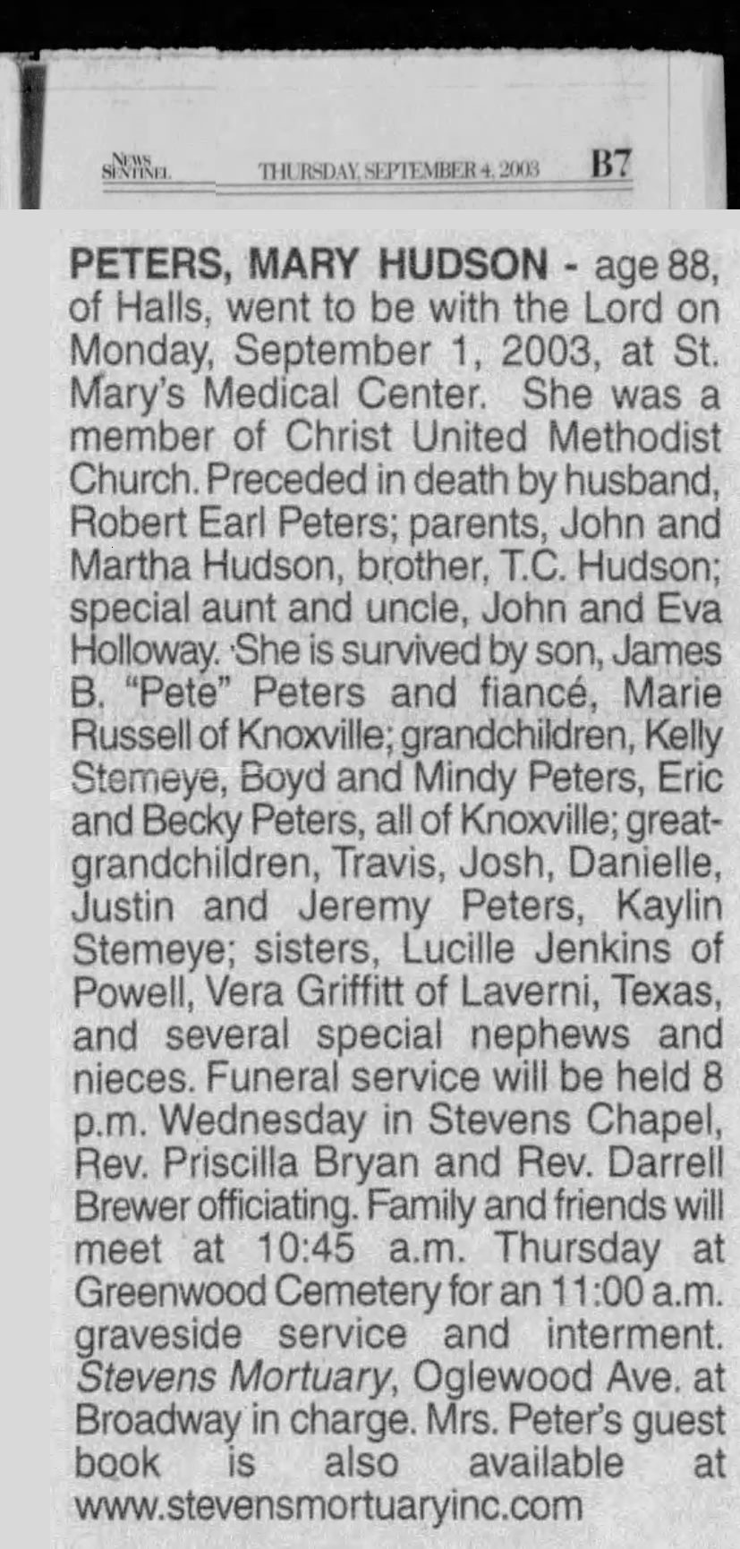 After the death of her mother, Mary was raised by her father's sister Eva (Ev) Hudson and Ev's husband John Henry Holloway. Ev was commonly known as "Aunt Ev", even by people who were not her nieces and nephews. (information provided by Ruth Peters Bryan)