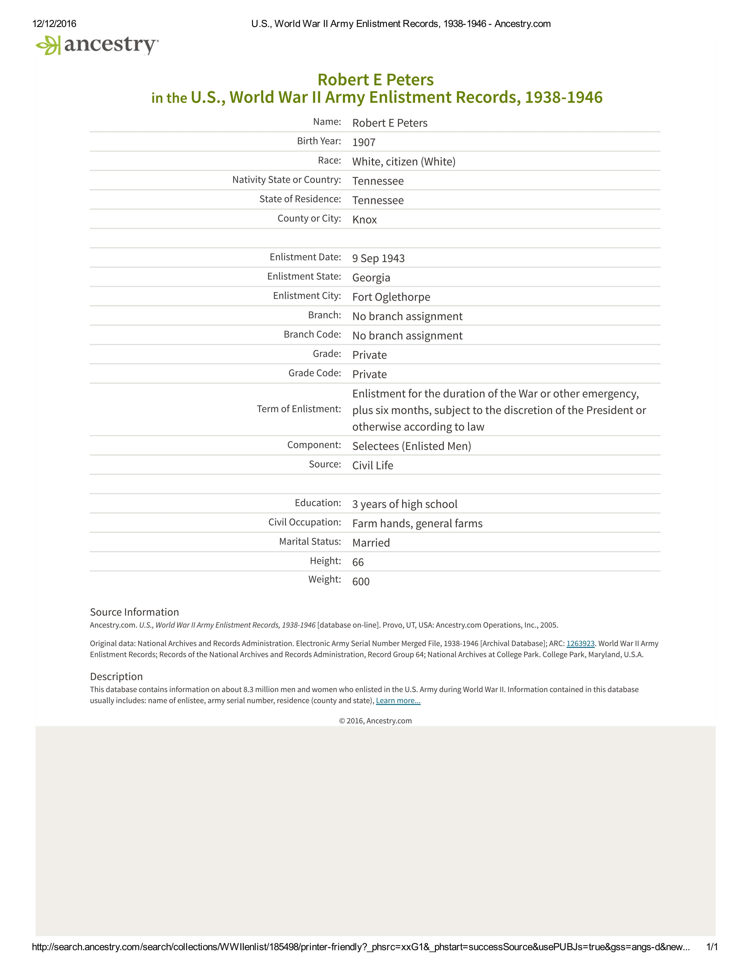 Name: Robert E Peters; Birth Year: 1907; Race: White, citizen (White); Nativity State or Country: Tennessee; State: Tennessee; County or City: Knox; Enlistment Date: 9 Sep 1943; Enlistment State: Georgia; Enlistment City: Fort Oglethorpe; Branch: No branch assignment; Branch Code: No branch assignment; Grade: Private; Grade Code: Private; Term of Enlistment: Enlistment for the duration of the War or other emergency, plus six months, subject to the discretion of the President or otherwise according to law; Component: Selectees (Enlisted Men); Source: Civil Life; Education: 3 years of high school; Civil Occupation: Automobile Serviceman; Marital Status: Married; Height: 66; Weight: 600.