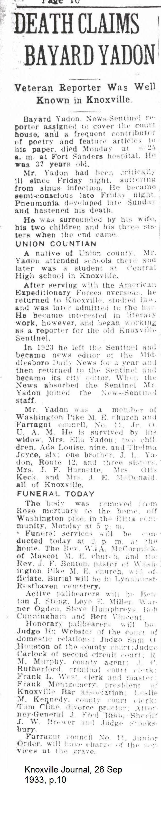 Bayard Yadon, New-Sentinel reporter assigned to cover the court house, and a frequent contributor of poetry and feature articles to his paper, died Monday at 6:25 a.m. at Fort Sanders Hospital. He was 37 years old. Mr. Yadon had been critically ill since Friday night, suffering from sinus infection. He became semi-conscious late Friday night. Pneumonia developed late Sunday and hastened his death. He was surrounded by his wife, his two children and his three sisters when the end came. A native of Union County, Mr. Yadon attended schools there and later was a student at Central High school in Knoxville. After serving with the American Expeditionary Forces overseas, he returned to Knoxville, studied law, and was later admitted to the bar. He became interested in literary work, however and began working as a reporter for the old Knoxville Sentinel. In 1923 he left the Sentinel and became news editor of the Middlesboro Daily News for year and then returned to the Sentinel and became its city editor. When the News absorbed the Sentinel Mr. Yadon joined the News-Sentinel staff. Mr. Yadon was a member of Washington Pike M. E. church and Farragut council, No. 11, Jr. O. U. A. M. He is survived by his widow, Mrs. Ella Yadon; two children, Ada Louise, nine, and Thelma Joyce, six; one brother, J. L. Yadon, Route 12, and three sisters, Mrs. J. F. Burnette, Mrs. Otis Keck, and Mrs. J. E. McDonald, all of Knoxville. The body was removed from Rose mortuary to home off Washington pike, and the Ritta community, Monday at 5 p.m. Funeral services will be conducted today at 2 p.m. at the home. The Rev. W. A. McCormack of Mascot M. E. church and the Rev. J. F. Benton, pastor of Washington Pike M. E. church, will officiate. Burial will be in Lynnhurst Resthaven Cemetery. Active pallbearers will be Benton J. Strong, Lloyd E Miller, Warner Ogden, Steve Humphreys, Bob Cunningham and Bert Vincent. Honorary pallbearers will be Judge Hu Webster of the court of domestic relations; Judge Sam O. Houston of the county court; Judge Carlock of second circuit court; R. M. Murphy, county agent; J. C. Rutherford, criminal court clerk; Frank L. West, clerk and master; Frank Montgomery, president of Knoxville Bar association; Leslie M. Kennedy, county court clerk; Tom Cline, divorce proctor; Attorney General J. Fred Bibb; Sheriff J. W. Brewer and Judge Stooksbury. Farragut council No 11, Junior Order, will have charge of the services at the grave.