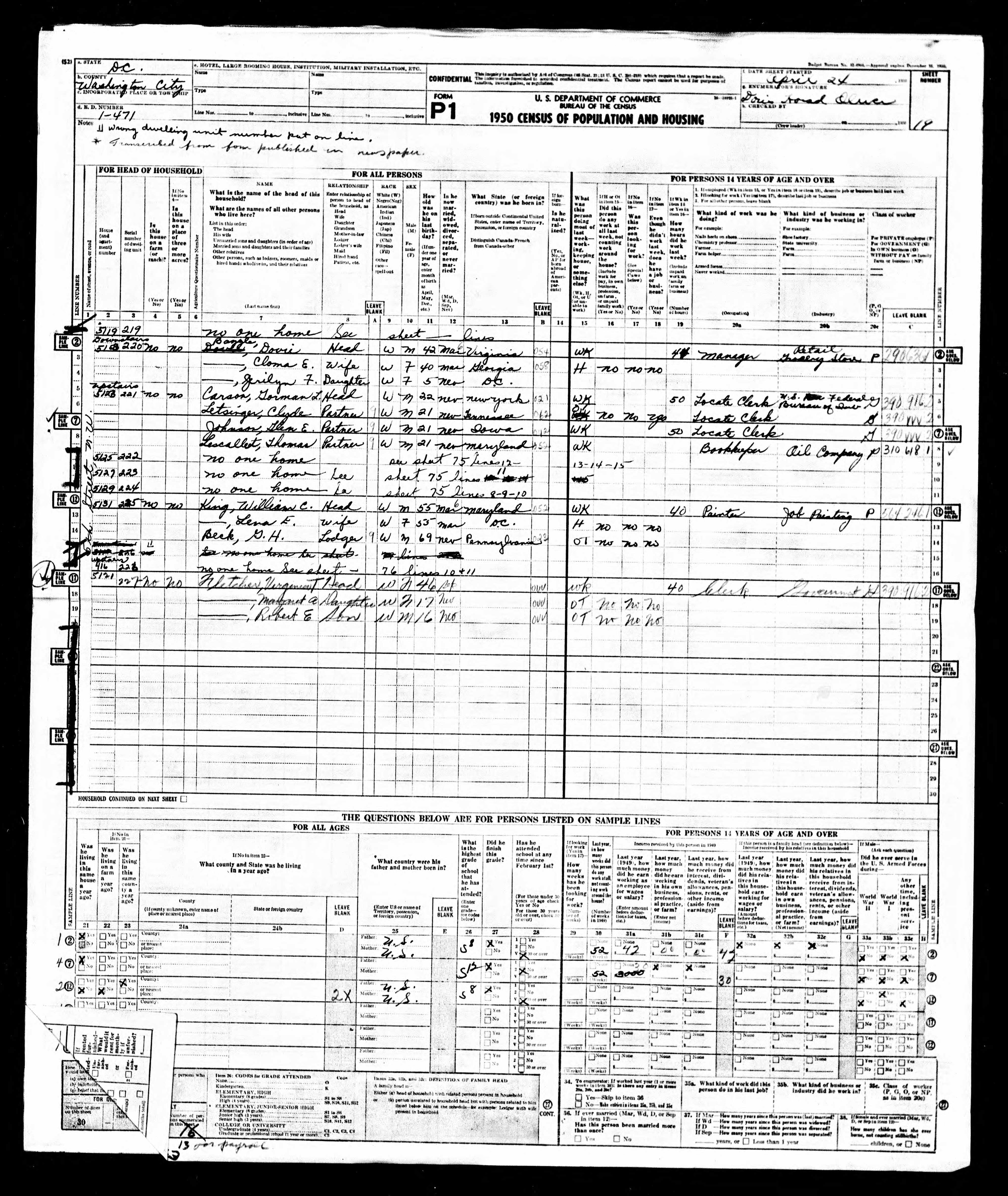 Enumeration District 1-471, Washington, D. C., 5123 5th Street N.W., 24 Apr 1950 Sheet 019, dwelling number 221 Carson Gorman L. 22 head m s w locate clerk U.S. Federal Bureau of Debt NY Letsinger Clyde 21 partner m s w locate clerk U.S. Federal Bureau of Debt TN Johnson Glen E. 21 partner m s w locate clerk U.S. Federal Bureau of Debt IA Lescallet Thomas 21 partner m s w bookkeeper oil company MD |