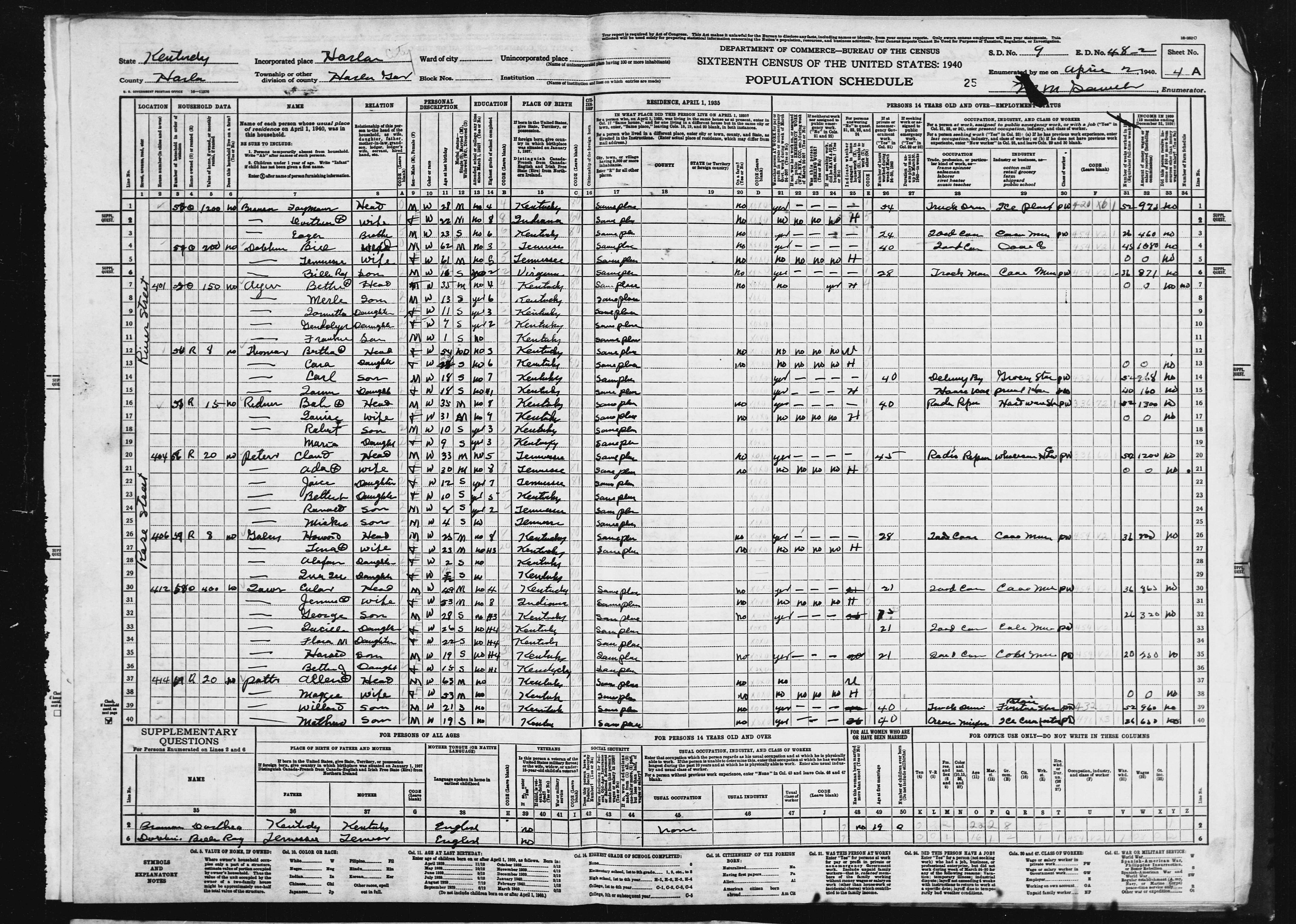 1940, Harlan, Harlan County, Kentucky, Enumeration District 1-6, page 25a |