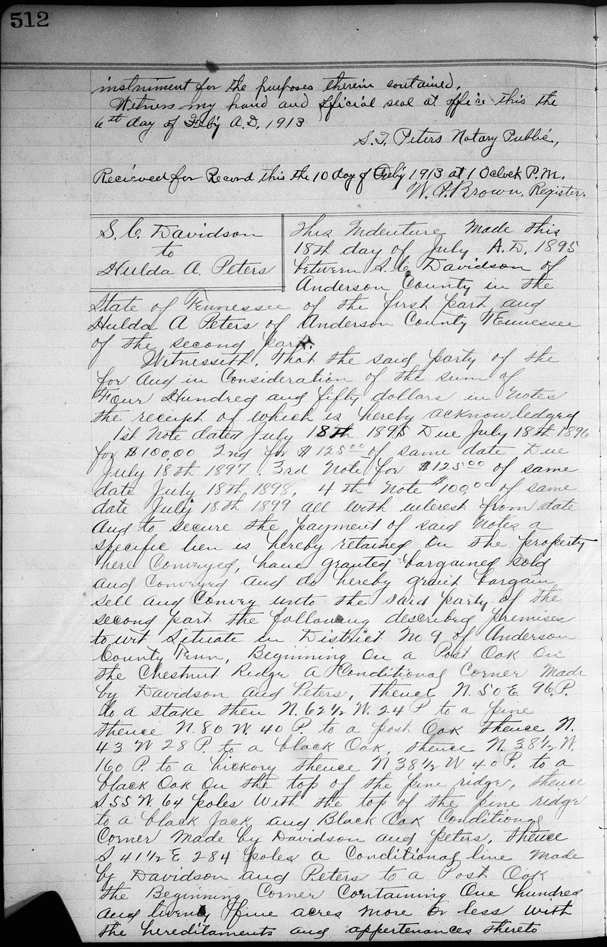 D-3 pp.512-513 Hulda A. Peters from S.C. Davidson 18 July 1895 Anderson County, Tennessee deed book D3, page 512 S. C. Davidson | This Indenture made this to | 18th day of July A.D. 1895 Hulda A. Peters | between A. C. Davidson of | Anderson County in the State of Tennessee of the first part and Hulda A Peters of Anderson County Tennessee of the second part. Witnesseth that the said party of the for And in consideration of the sum of Four Hundred and fifty dollars in notes the receipt of which is hereby acknowledged 1st Note dated July 18th 1895 Due July 18th 1896 for $100.00 2nd for $125.00 of same day Due July 18th 1897. 3rd Note for $125.00 of same date July 18th 1898, 4th note $100.00 of same date July 18th 1899 All with interest from date And to secure the payment of said Notes a specific lien is hereby retained On the property here Conveyed, have granted bargained sold and Conveyed and do hereby grant, bargain sell And Convey unto the said party of the second part the following described premises to wit Situate (sic) in District No 9 of Anderson County Tenn, Beginning on a Post Oak on the Chestnut Ridge a Conditional Corner Made by Davidson and Peters, thence N. 50 E 96 P. to a stake thence N.62.5 W 24 P to a pine thence N. 80 W 40 P. to a post Oak thence N. 43 W 28 P. to a black Oak thence N. 38.5 W. 160 P. to a hickory thence N 38.5 W 40 P. to a black Oak On the top of the pine ridge, thence S. 55 W. 64 poles with the top of the pine ridge to a black Jack and Black Oak Conditional Corner Made by Davidson and Peters, thence S. 41.5 E 284 poles a conditional line Made by Davidson and Peters to a Post Oak the Beginning Corner Containing One hundred and twenty five acres more or less with the hereditaments and appurtenances thereto Anderson County, Tennessee deed book D3, page 513 appertaining hereby releasing all Claims to Homestead and Dower therein. To Have and to Hold the said premises to the said party of the second part his her heirs and assigns forever. And the said party of the first part for himself and for his heirs executors and Admnistrators doth hereby covenant with the said party of the second part her heirs and assigns that he is lawfully seized in fee simple of the premises above conveyed and has full power authority and right to Convey the same that said premises are free from all incumbrances and that he will forever warrant and defend the said premises and the title thereto against the lawful Claims of all persons whomsoever. In Witness Whereofe, The said party of the first part has herunto set his hand and seal the day and Year first written. Signed sealed and delivered S. C. Davidson (L.S.) in presence of J. H. Davidson S. K. Collins State of Tennessee | Personally appeared before Roane County | me C. B. Sevier Notary Public | of said County the within Named bargainor S. C. Davidson with whom I am personally acquainted, And who ackowledged that he executed the within instrument for the purposes therein Contained. Witness my hand at office this 18 day of April A.D. 1902. C. B. Sevier Notary Public Received for Record the 13th day of Feby A.D. 1913 at 1 Oclock P.M. W. A. Brown Register |