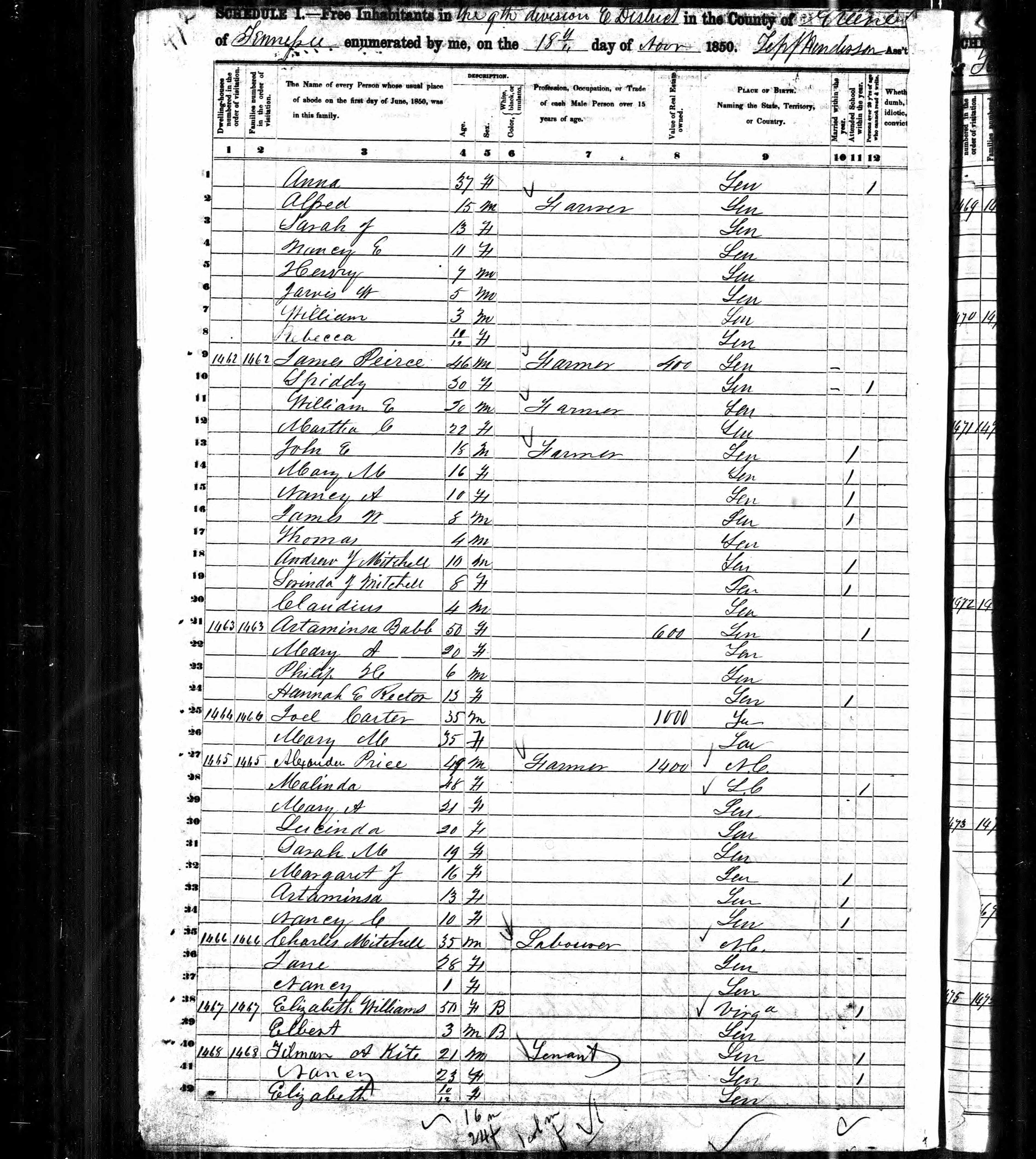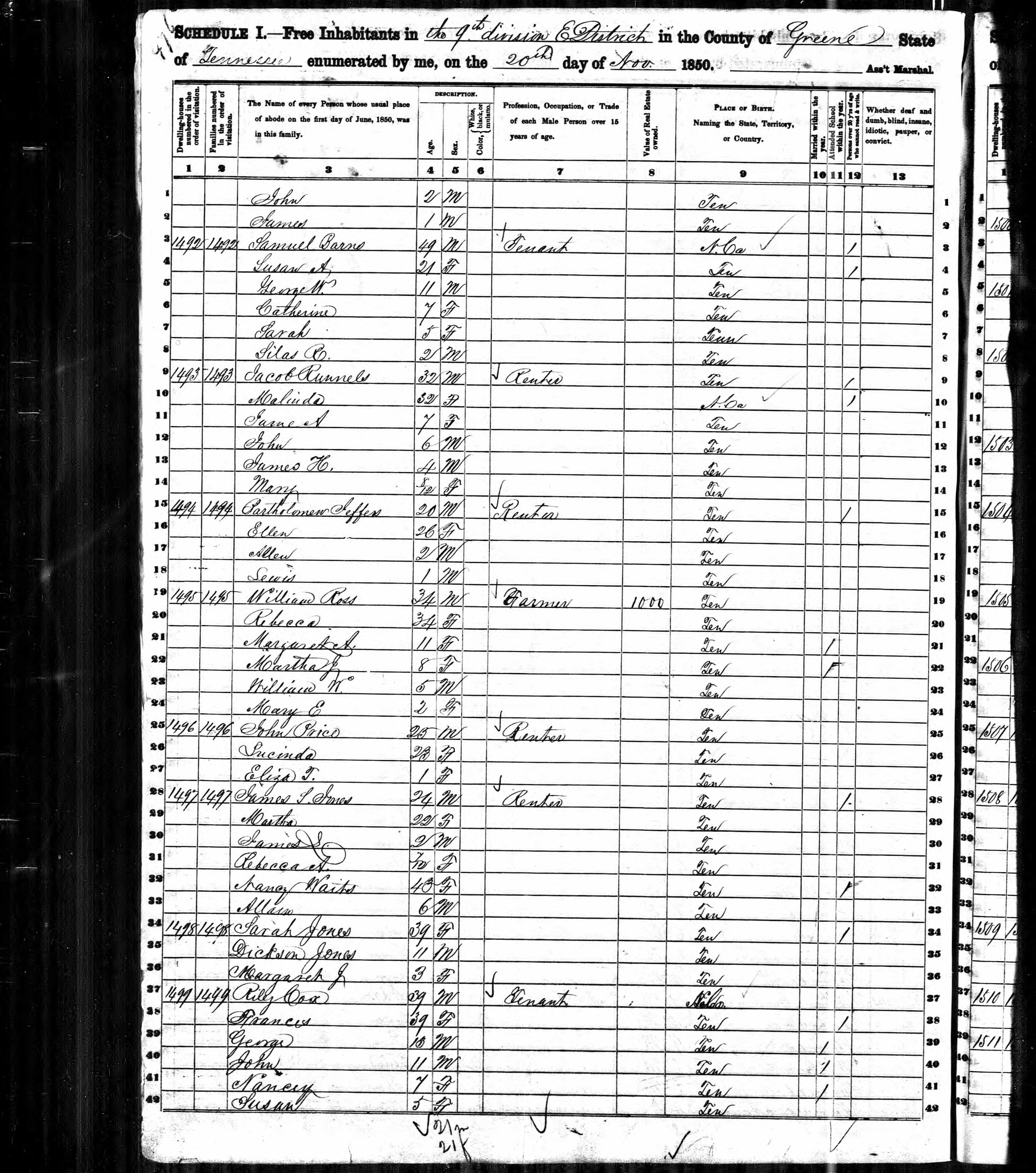 9th Division Eastern District, Greene County, 16 Nov 1850 page 237b, dwelling number 1462, family number 1462 Peirce James 46 m w farmer $400 TN Spiddy 30 f w TN cannot R/W William E. 20 m w farmer TN Martha C. 22 f w TN John E. 18 m w farmer TN attended school Mary M. 16 f w TN Nancy A. 10 f w TN attended school James W. 8 m w TN attended school Thomas 4 m w TN Mitchell Andrew J. 10 m w TN attended school Lorinda J. 8 f w TN attended school Claudius 4 m w TN |